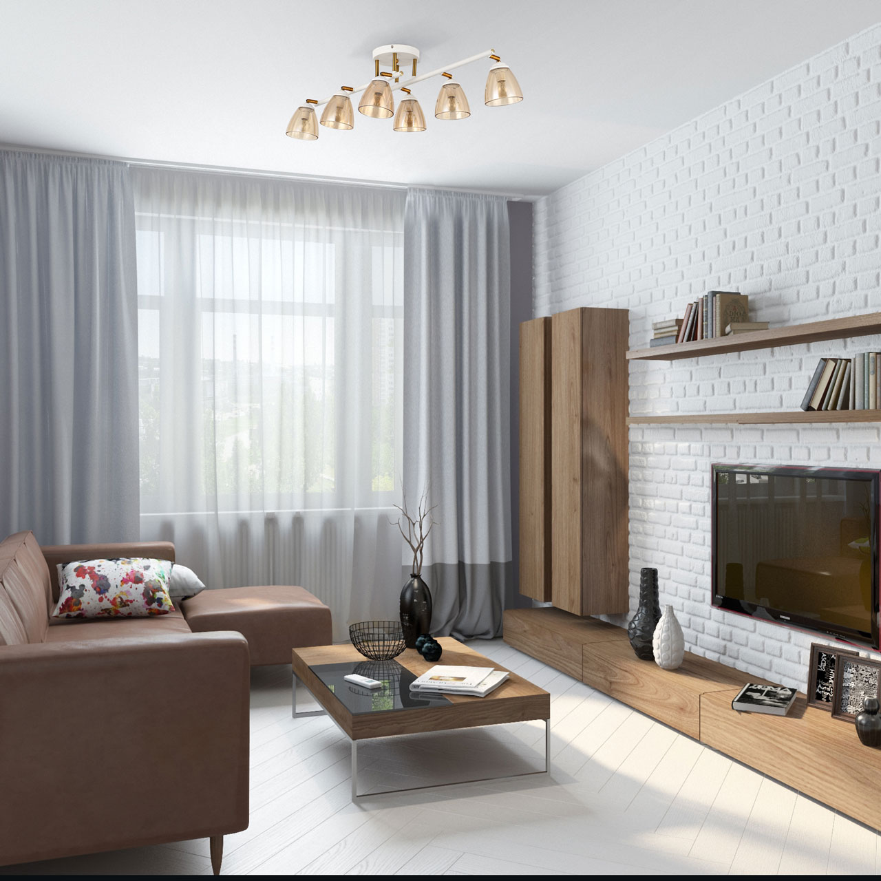 Металлическое основание потолочного светильника окрашено в белый цвет. Отдельные элементы гальванизированы в цвет матовой бронзы. Стеклянные плафоны гальванизированы в цвет шампань.