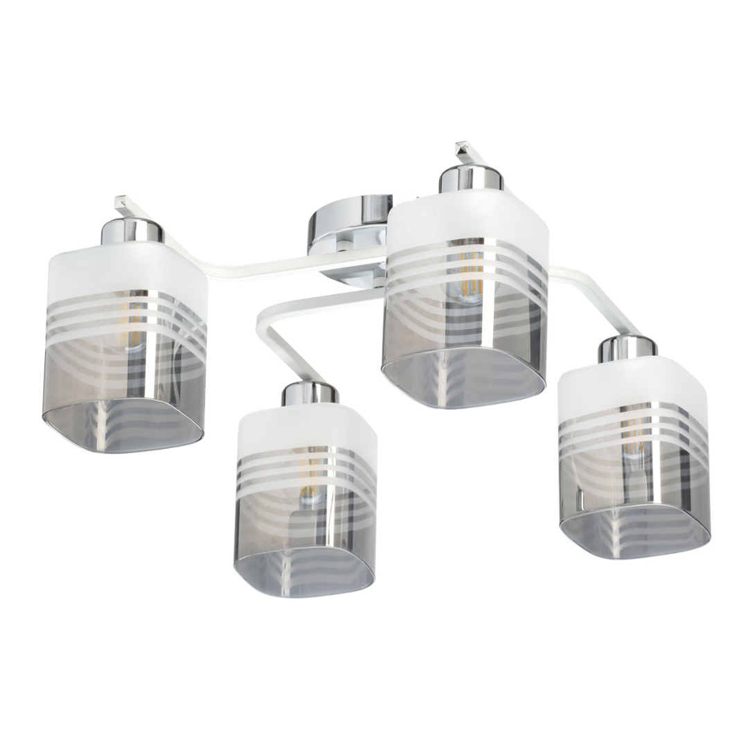 Металлическое основание потолочного светильника окрашено в белый цвет. Отдельные элементы гальванизированы в цвет хрома. Стеклянные плафоны гальванизированы в дымчатый цвет и окрашены в белый цвет в виде параллельных полос