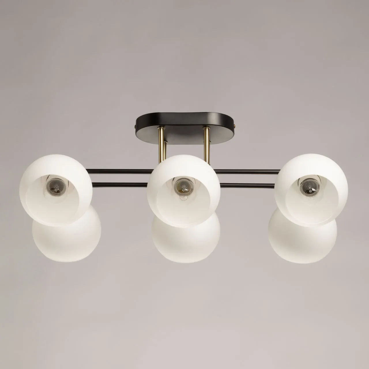 Металлическое основание потолочной люстры окрашено в черный цвет. Отдельные элементы гальванизированы в цвет античной бронзы. Светильник декорирован стеклянными плафонами белого матового цвета.