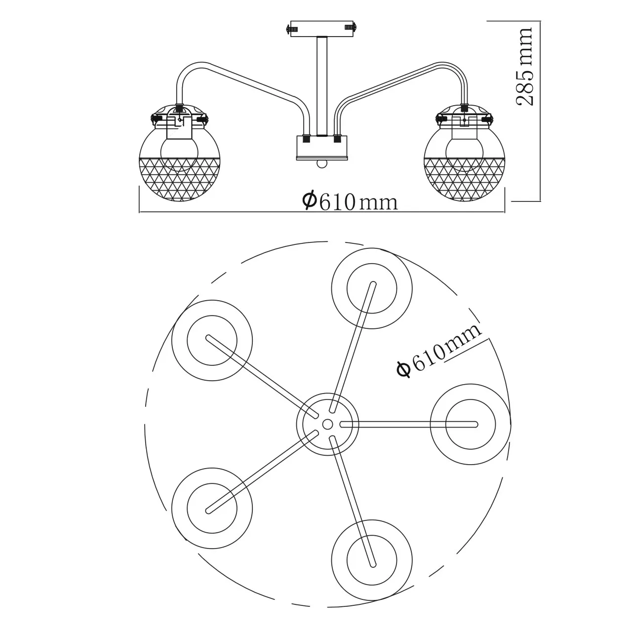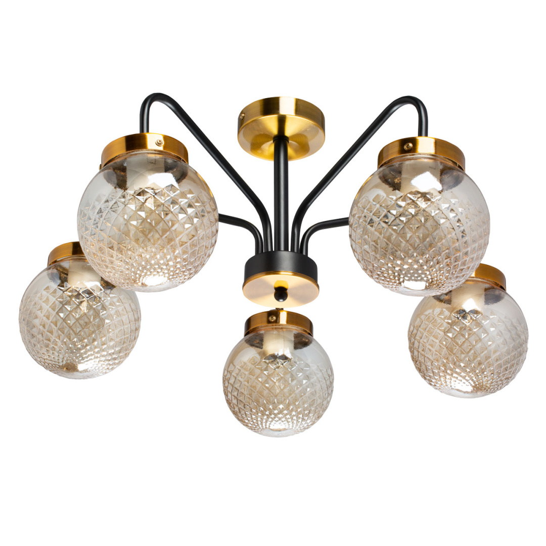 Основание светильника выполнено из металла. Потолочная чаша и держатели плафонов гальванизированы в цвет бронзы, рожки окрашены в черный цвет. Стеклянные плафоны отлиты в сложную фактурную форму и гальванизированы в цвет коньяк