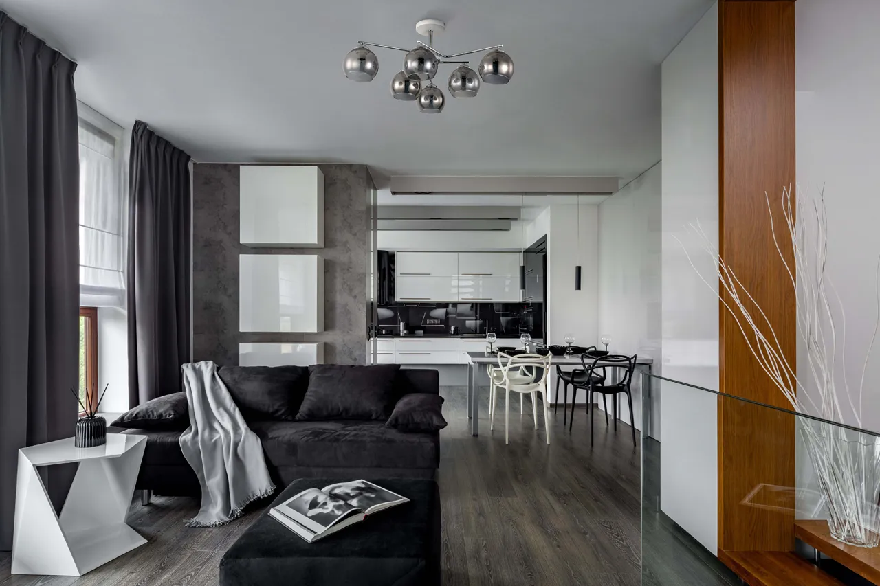 Металлическое основание светильника гальванизировано в цвет хрома. Отдельные элементы основания окрашены в белый цвет. Светильник декорирован стеклянными плафонами, гальванизированными в дымчатый цвет.