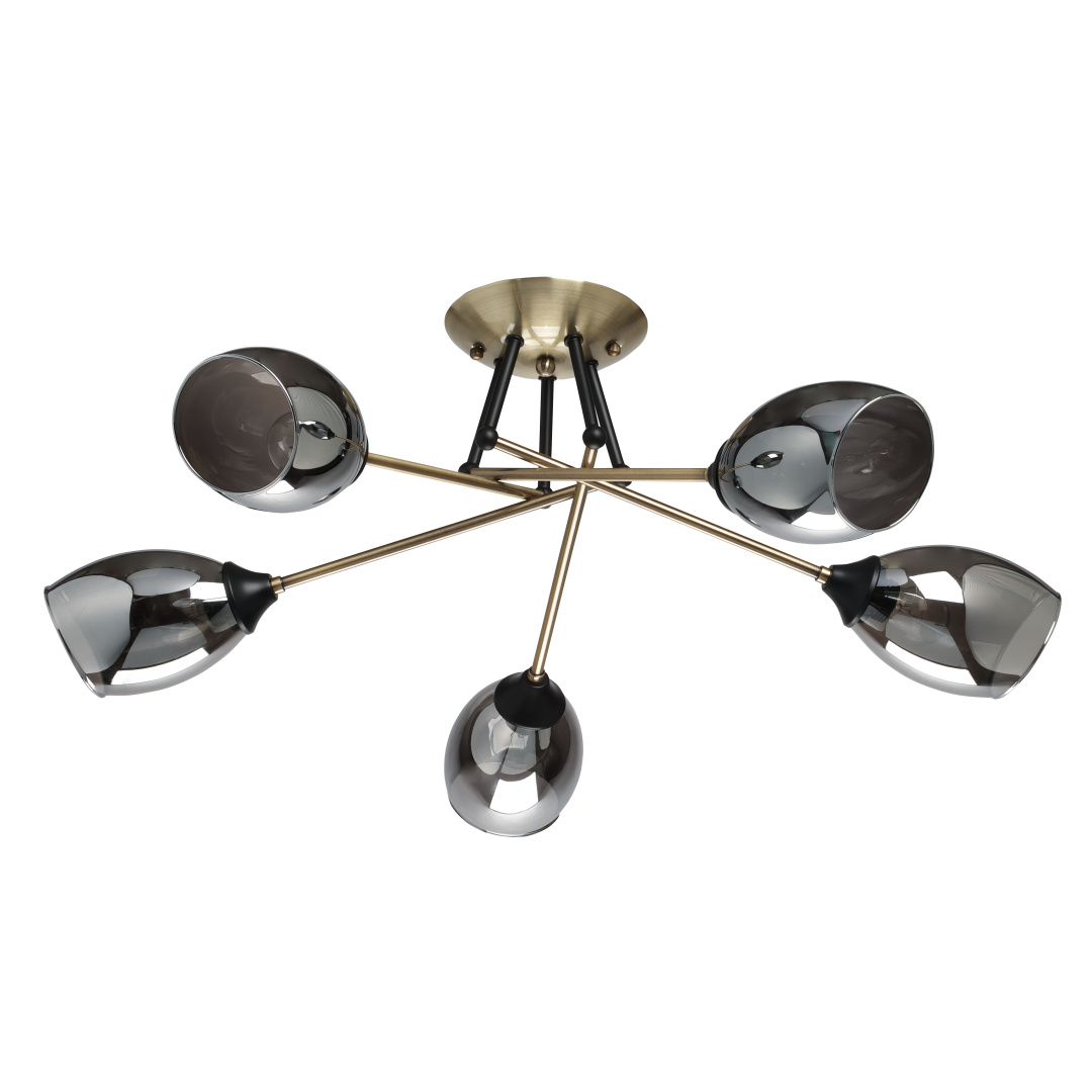 Металлическое основание потолочной люстры гальванизировано в цвет античной бронзы. Отдельные элементы основания окрашены в черный цвет. Традиционные источники света закрыты стеклянными плафонами, гальванизированными в дымчатый цвет.