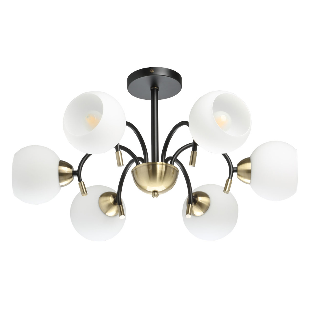 Металлическое основание подвесной люстры окрашено в черный цвет. Отдельные элементы основания гальванизированы в цвет античной бронзы. Светильник декорирован стеклянными плафонами белого цвета.