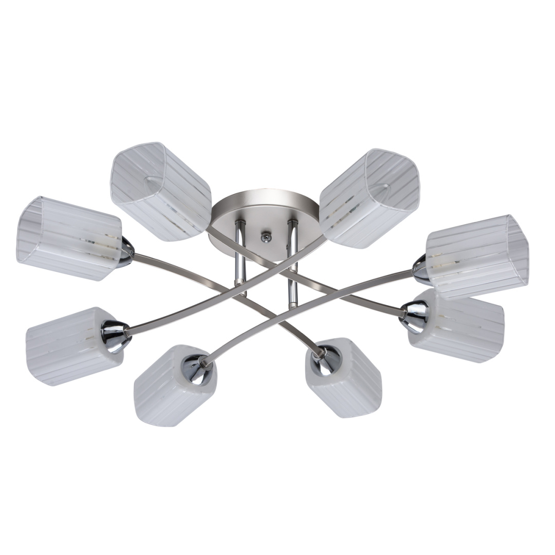 Основание: металл. Потолочная чаша и рожки окрашены в цвет перламутрового серебра, стержни и держатели плафонов - гальванизация в цвет хрома. Потолочная чаша и держатели плафонов изготовлены по технологии обработки на токарном станке. Плафоны: стекло, отлито в форму. Плафоны матированы по трафарету.