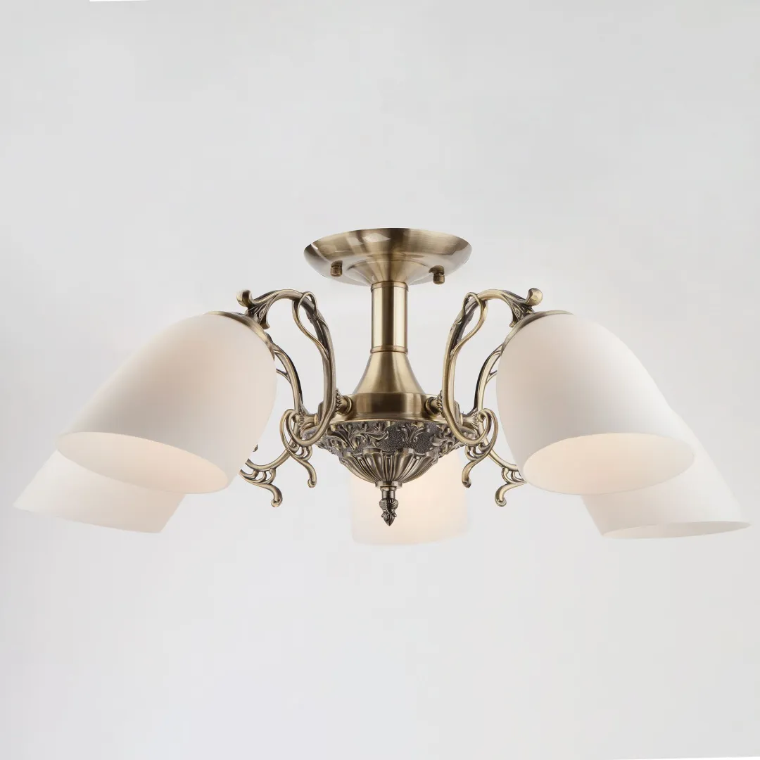 Организовать качественное освещение вам поможет современная потолочная люстра со стеклянными плафонами из коллекции Ariele. Простые эргономичные формы и умеренные тона станут прекрасным дополнением для вашего интерьера, а классический дизайн с нежными белыми плафонами и бронзовым оттенком арматуры привносит в интерьер нотку винтажного очарования и благородства.