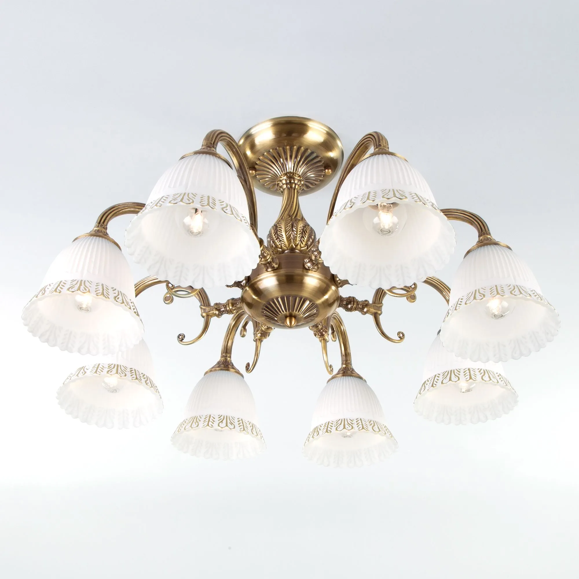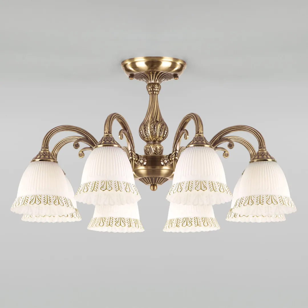 Классическая люстра со стеклянными плафонами 60107/8 античная бронза из коллекции Campina предназначена для создания основного освещения в современных и классических интерьерах. Изящные линии и детали в стиле ретро придают люстре неповторимый шарм и элегантность. Плафоны из матового стекла с золотистым орнаментом обеспечивают равномерное и приятное освещение. Люстра осветит помещение площадью 21 м².