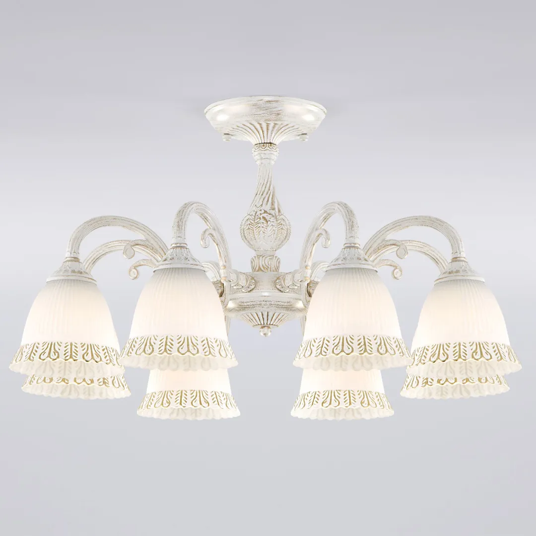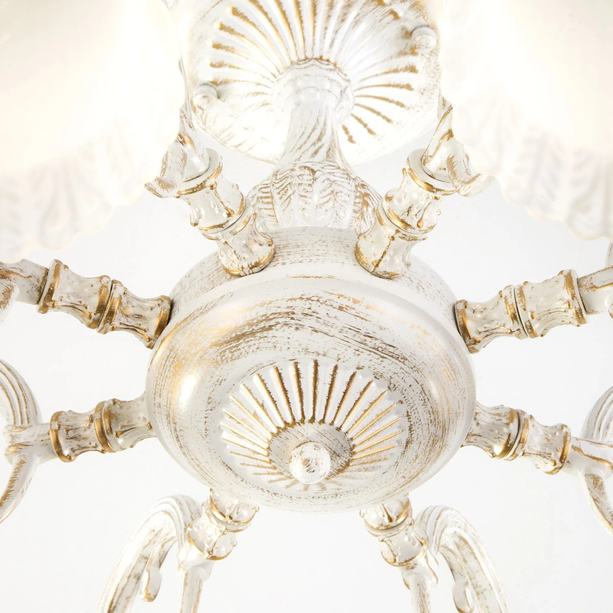 Классическая люстра со стеклянными плафонами 60107/8 белый с золотом из коллекции Campina предназначена для создания основного освещения в современных и классических интерьерах. Изящные линии и детали в стиле ретро придают люстре неповторимый шарм и элегантность. Плафоны из матового стекла с золотистым орнаментом обеспечивают равномерное и приятное освещение. Люстра осветит помещение площадью 21 м².