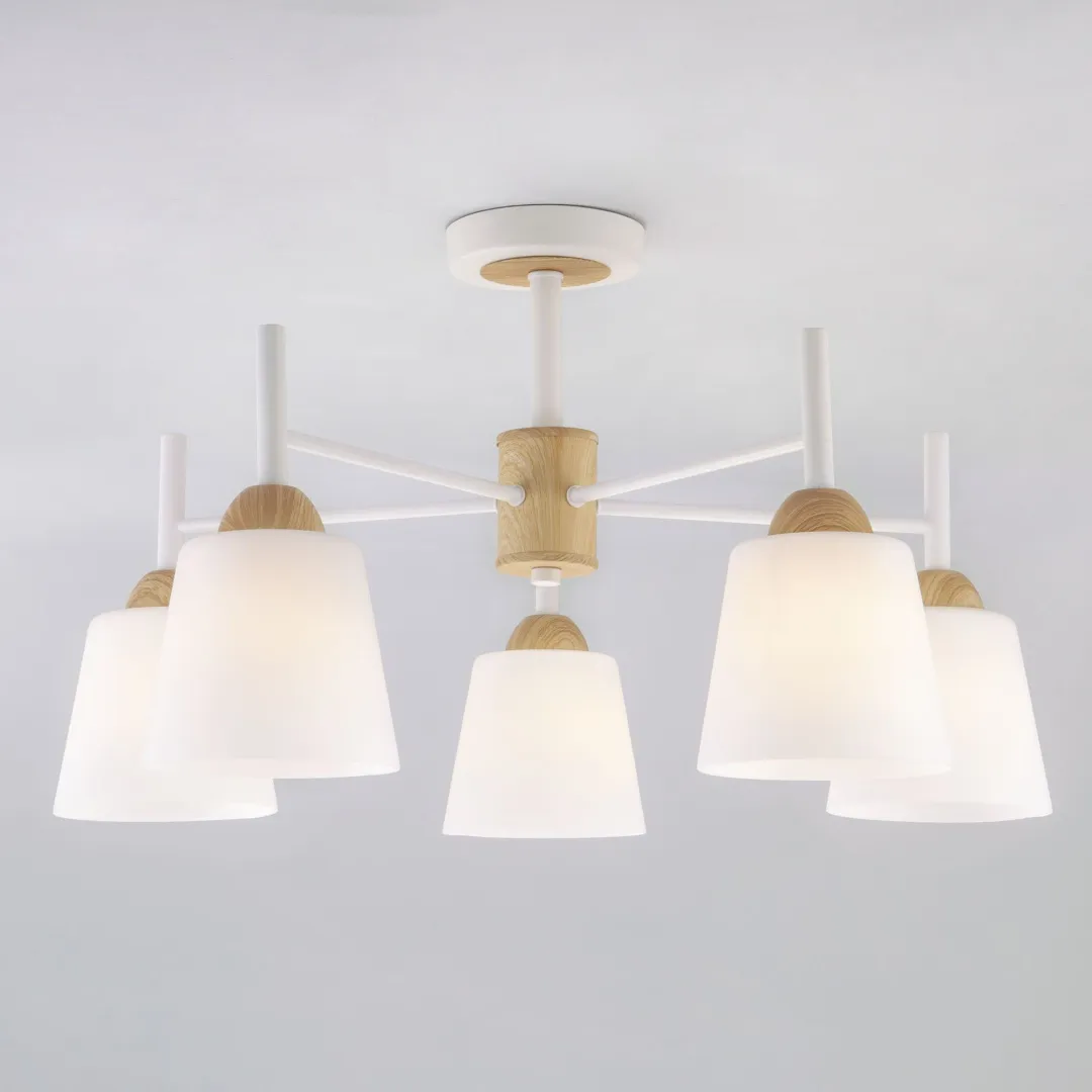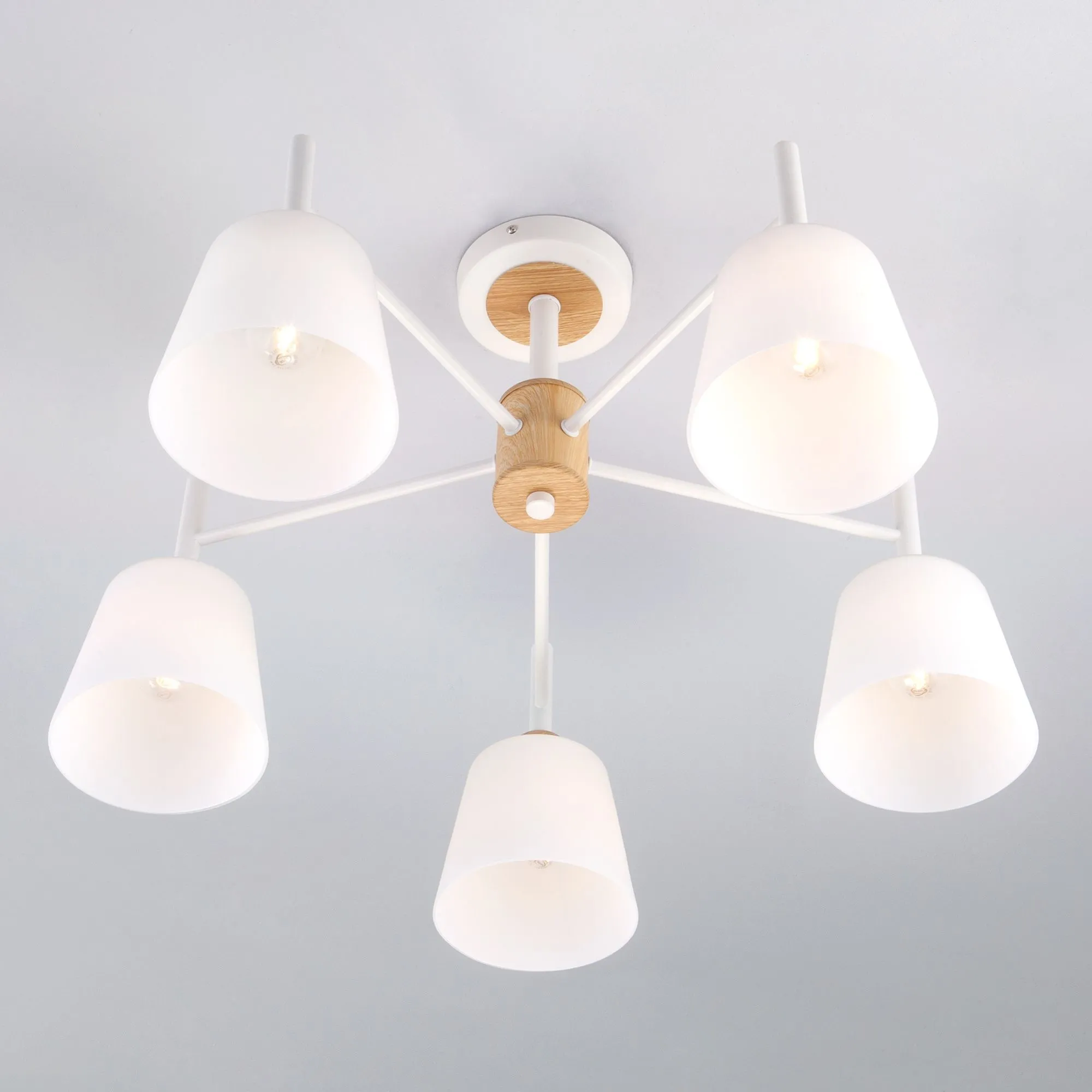Люстра дополнена матовыми стеклянными плафонами обеспечивающими мягкий, рассеянный свет создавая уютную и комфортную атмосферу в вашей гостиной, спальне или столовой, а плавные линии белого металлического каркаса гармонично сочетающиеся с абажурами конической формы и декоративными элементами, имитирующими натуральное дерево, добавляют нотку скандинавского стиля.