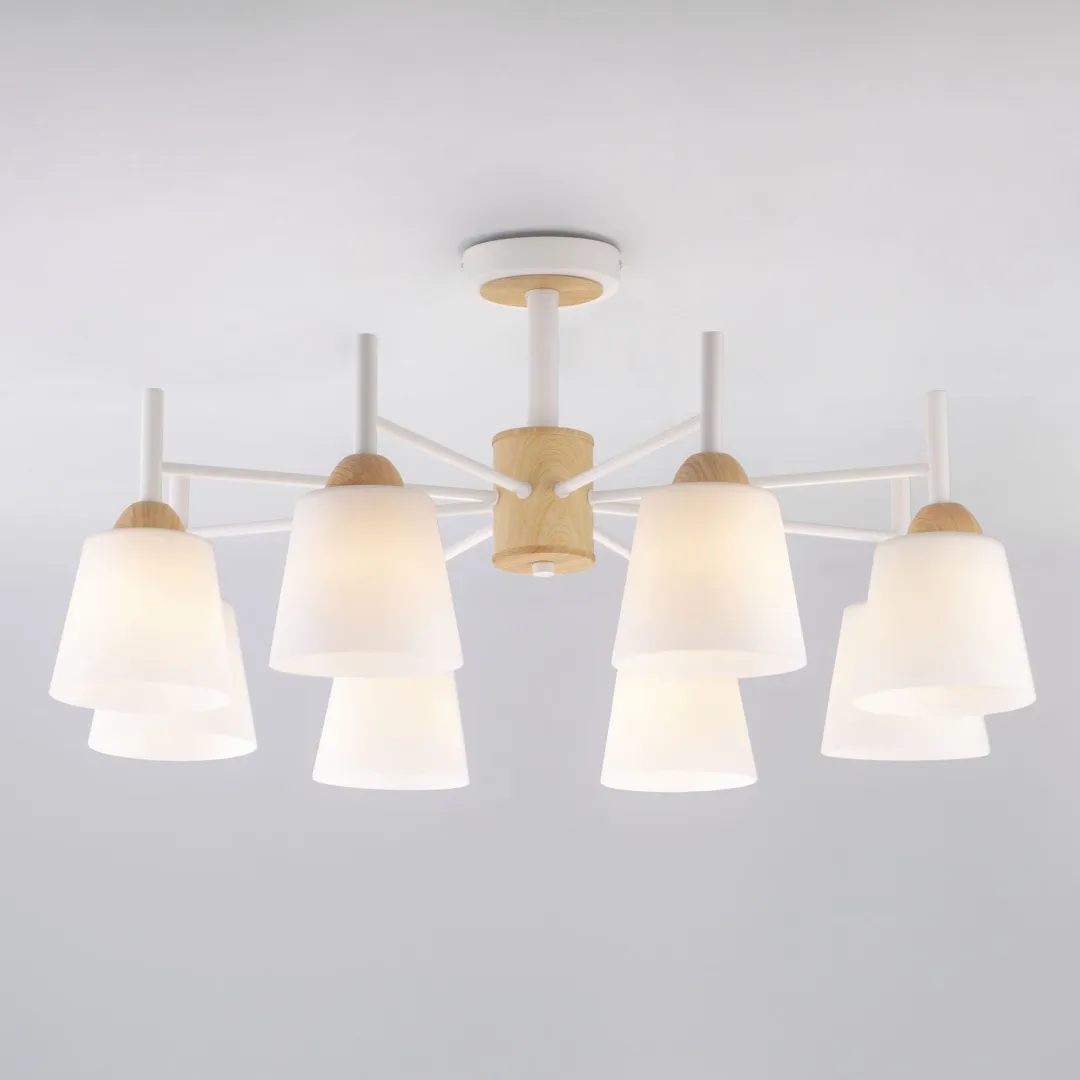 Люстра дополнена матовыми стеклянными плафонами обеспечивающими мягкий, рассеянный свет создавая уютную и комфортную атмосферу в вашей гостиной, спальне или столовой, а плавные линии белого металлического каркаса гармонично сочетающиеся с абажурами конической формы и декоративными элементами, имитирующими натуральное дерево, добавляют нотку скандинавского стиля.