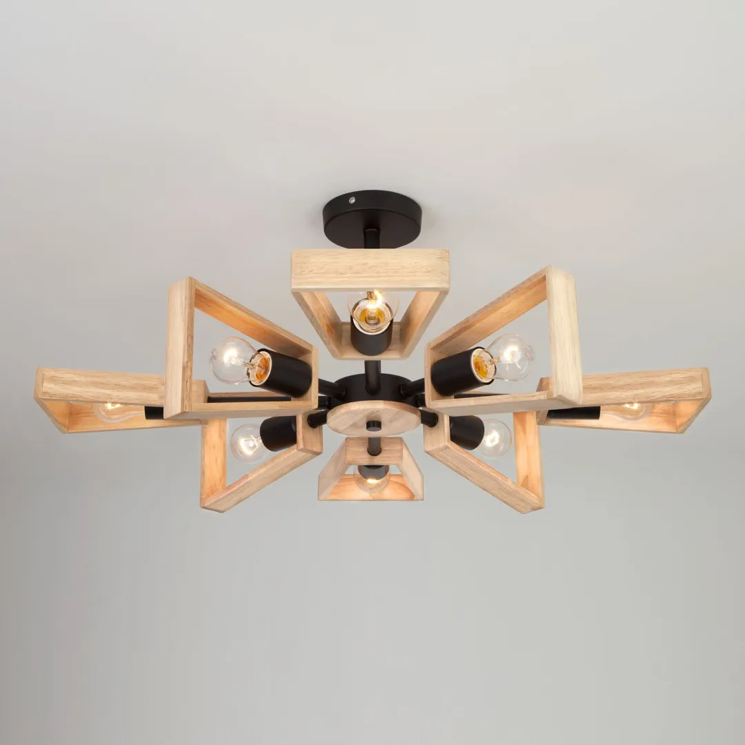 Дизайнерская люстра оснащена патронами с цоколем Е27, которые рассчитаны на максимальную мощность ламп 40 Вт. Люстра в стиле лофт украшена выразительными деревянными плафонами. Арматура изготовлена из высококачественного металла с надежным защитным покрытием.