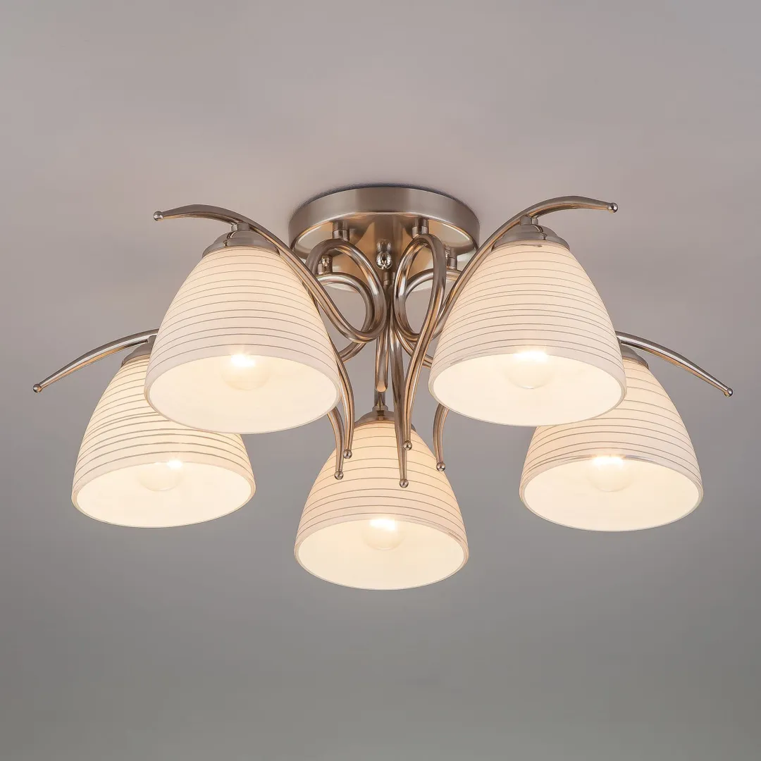 Потолочная люстра со стеклянными плафонами из коллекции Megan предназначена для основного освещения в современных интерьерах, подходит для различных типов помещений и рассчитана на площадь освещения 10 м². Пять плафонов конической формы, выполненные из белого матового стекла с деликатными горизонтальными полосками, рассеивают мягкий, приятный свет. Металлический каркас с изящными, плавными линиями придает люстре современный и утонченный вид.