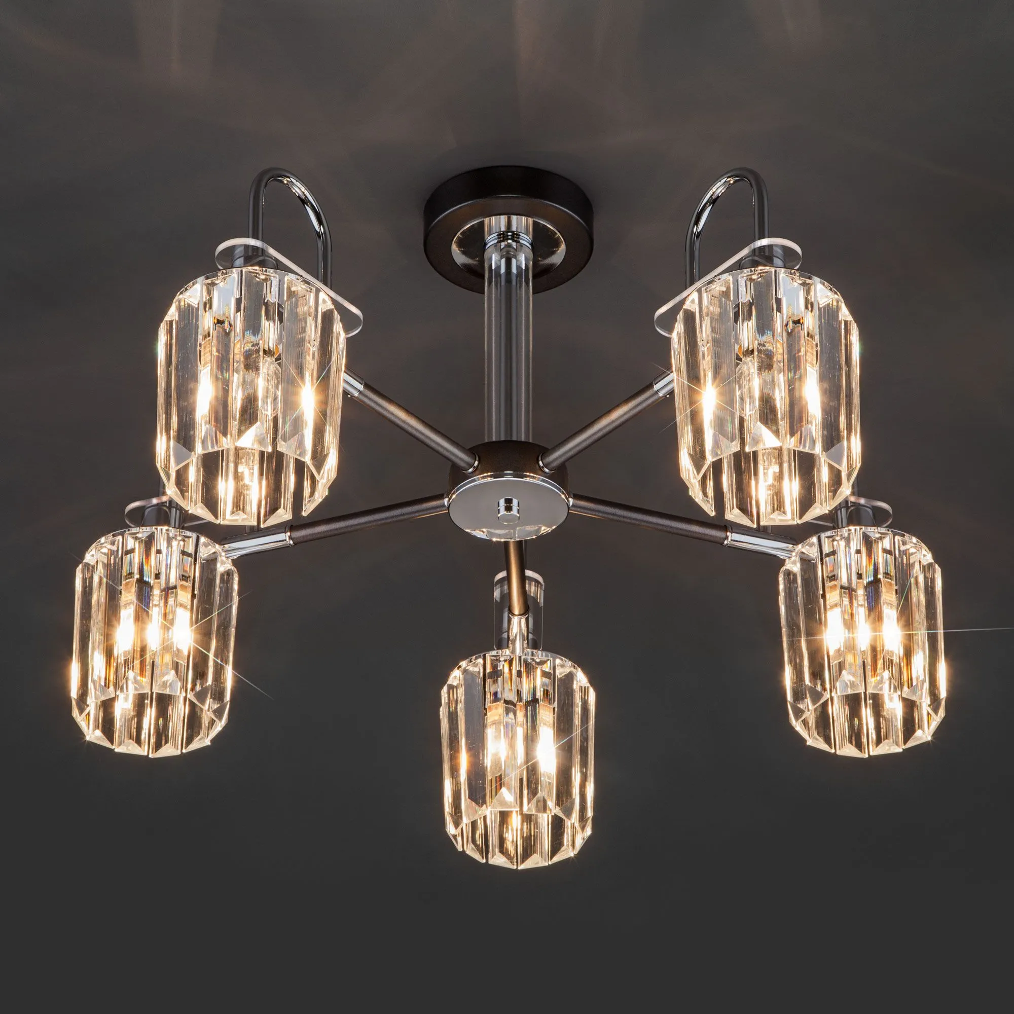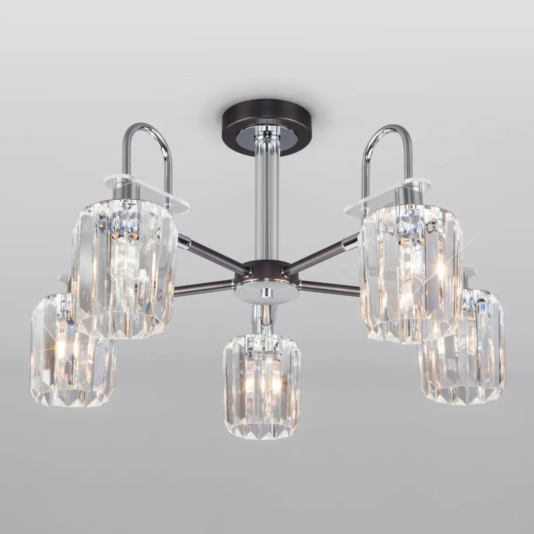 В пятирожковой люстре используются сменные лампы с цоколем E14, рассчитанные на максимальную мощность 60 Вт. Потолочный светильник оснащен хрустальными плафонами.