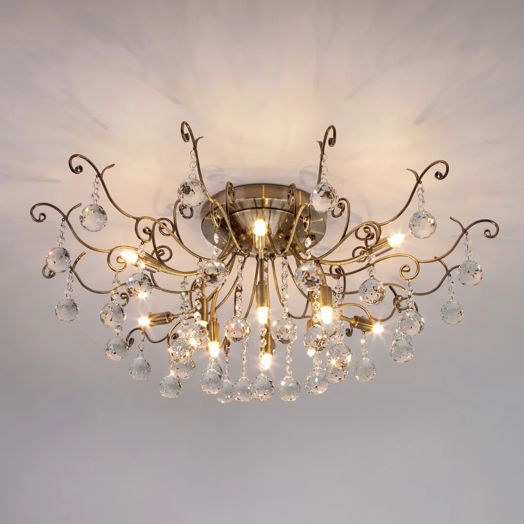 Выразительная хрустальная люстра на 12 рожков в цвете античная бронза преобразит потолочное пространство и создаст в вашем помещении полноценное освещение на площади 15 м кв.