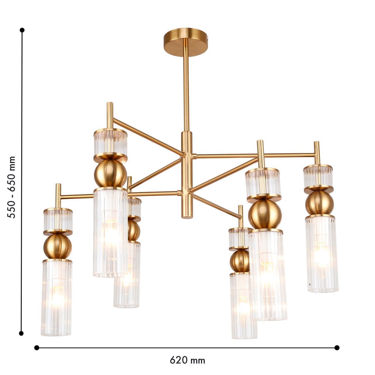 Металлический каркас в латунном цвете, стеклянный плафон с вертикальными насечками, разделенный декоративным элементом в виде металического шарика, сменная лампа, регулируемая высота.