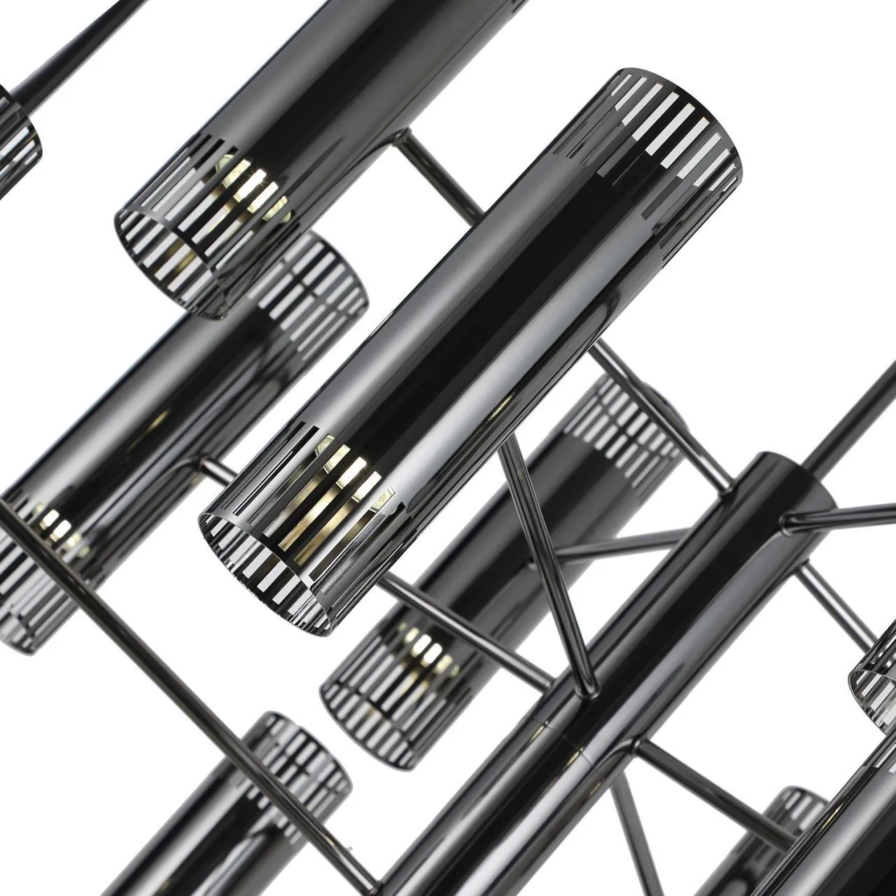 Каркас люстры в цвете черных хром, плафоны в форме удлиненного цилиндра с декоративными прорезями по краям, два источника света внутри плафонов, направленные вверх и низ, сменная лампа G9.