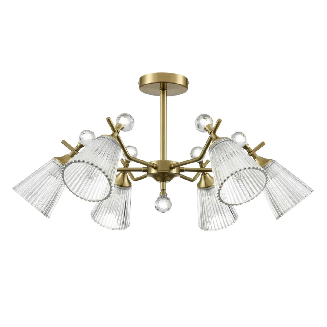 Классическая серия AURICA - это крупные стеклянные плафоны и основание цвета латунь. Изюминка этой люстры - большие хрустальные шарики, которые венчают рожки, добавляя блеска и лоска в интерьер. Прозрачные граненые плафоны изготовлены из толстого стекла с отличными оптическими свойствами, что в целом усиливает сияние светильника.
