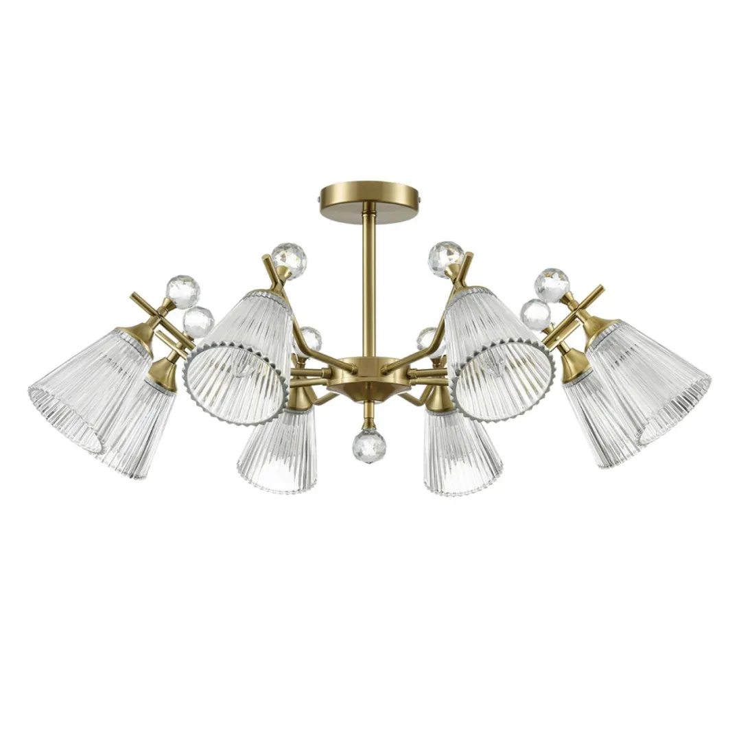 Классическая серия AURICA - это крупные стеклянные плафоны и основание цвета латунь. Изюминка этой люстры - большие хрустальные шарики, которые венчают рожки, добавляя блеска и лоска в интерьер. Прозрачные граненые плафоны изготовлены из толстого стекла с отличными оптическими свойствами, что в целом усиливает сияние светильника.