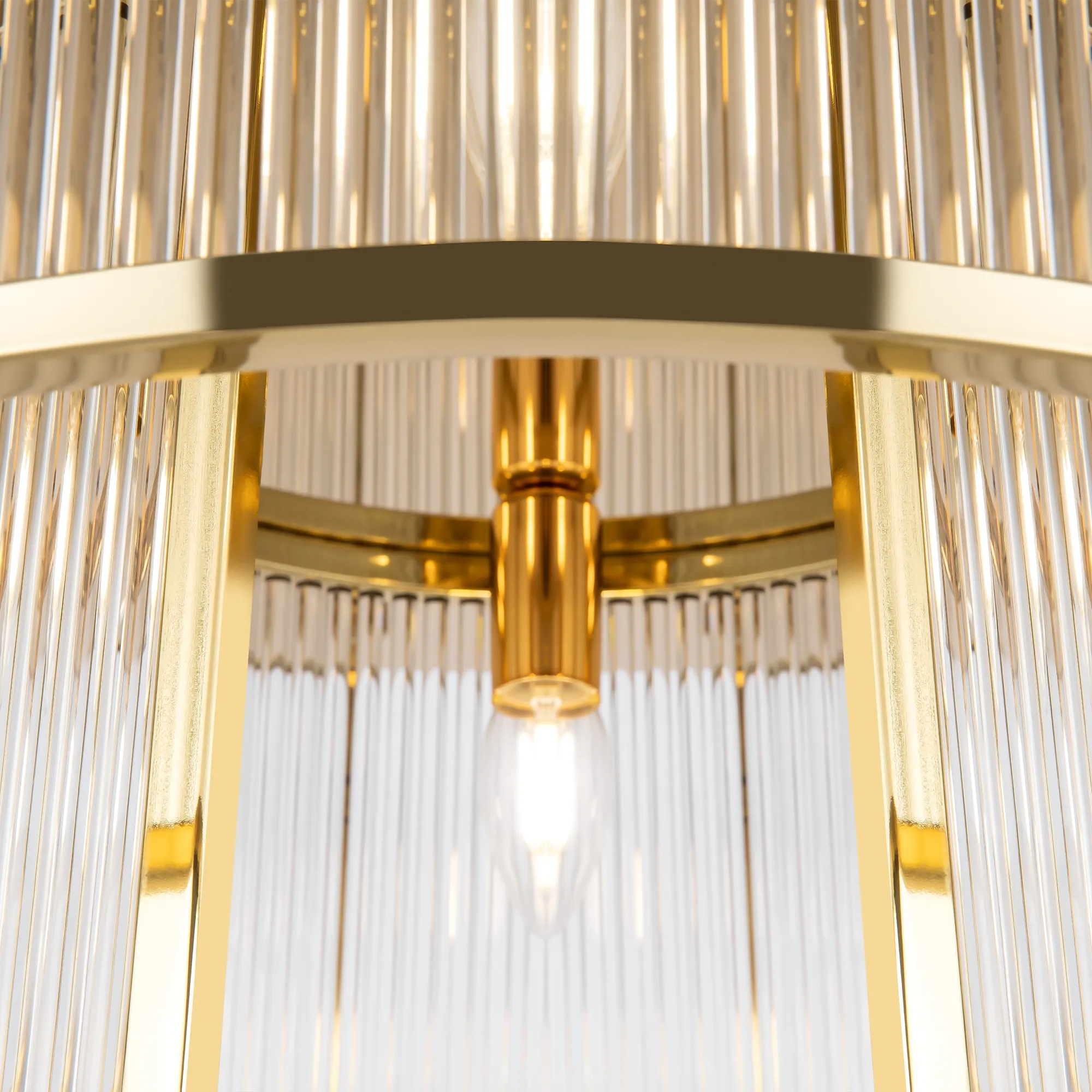 Материал арматуры - металл, цвет - золото. Декоративный элемент из прозрачного стекла в форме рельефных трубок. Цоколь Е14. Лампы в комплект не входят.