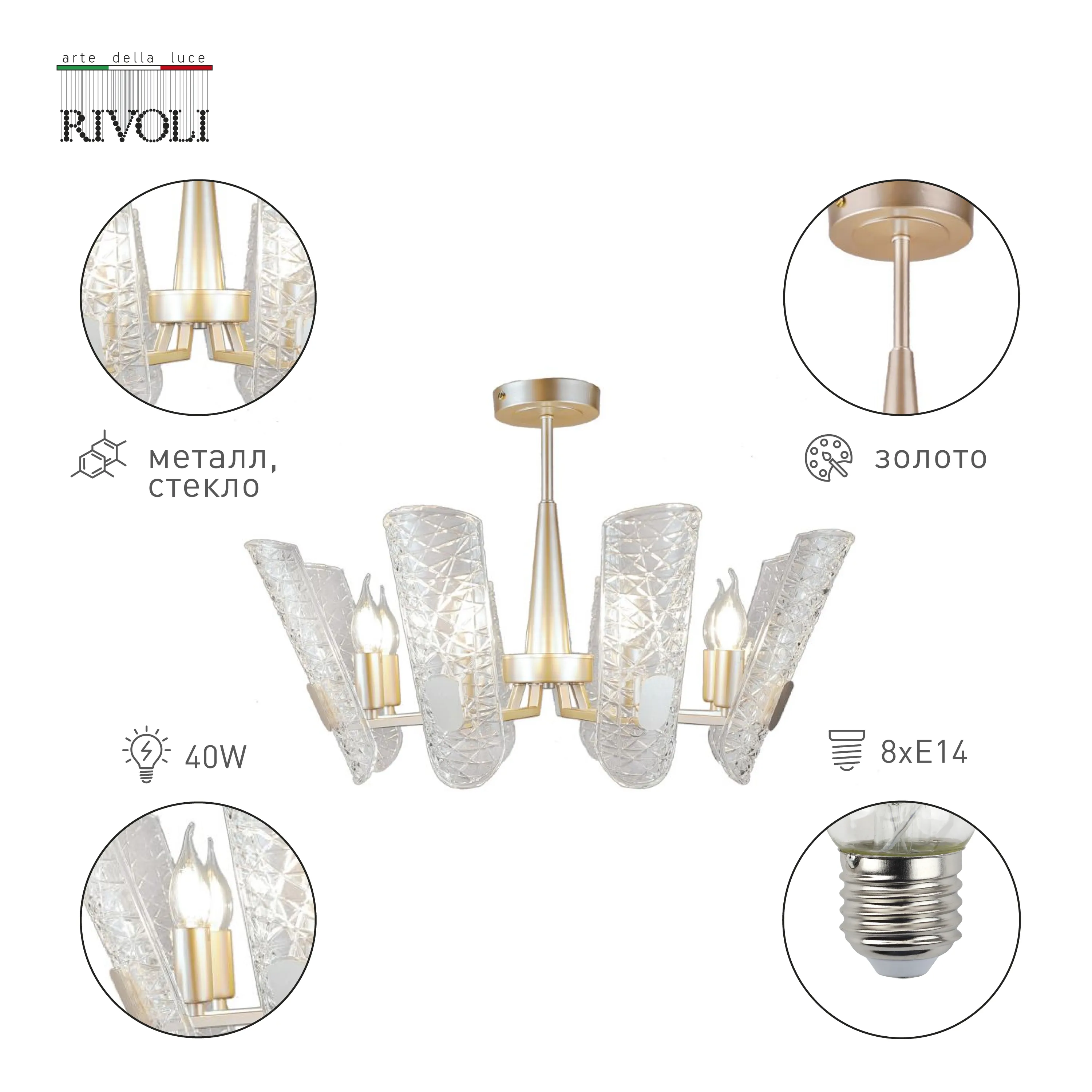 Дизайнерские люстры Rivoli Dolores (арт. 4087-308) под 8 ламп Е14 40 Вт. Люстры потолочные Dolores Rivoli имеют оригинальные стеклянные плафоны в замковом стиле. Рельефное прозрачное стекло люстры Dolores от итальянского бренда Rivoli удачно сочетается с минималистичной арматурой золотого цвета. Люстры на потолок Dolores отлично пропускают свет, освещая пространство площадью 24 м2. Люстры в гостиную Rivoli Dolores эффектно смотрятся с лампами в колбе свеча. Люстры в спальню Dolores Rivoli подходят для интерьеров в стиле модерн, скандинавский, замковый, ретро, кантри, восточный, эклектика.