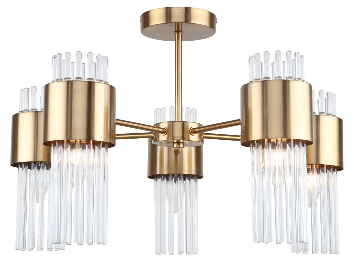 5-рожковая люстра на штанге в цвете французское золото, с трубчатыми стеклянными плафонами. Люстра потолочная применяется с 5 лампами Е14 мощностью 40 Вт, освещает площадь до 15 м2. Люстра с цилиндрическими плафонами из стекла будет удачно смотреться в гостиной, в спальне, на кухне, в кабинете, в загородном доме. Люстры и светильники коллекции Rivoli Donna подходят для оформления пространств сегмента horeca – рестораны, кафе, гостиницы. Эти люстры потолочные заказывают в интерьеры театров, концертных залов, фойе общественных пространств.