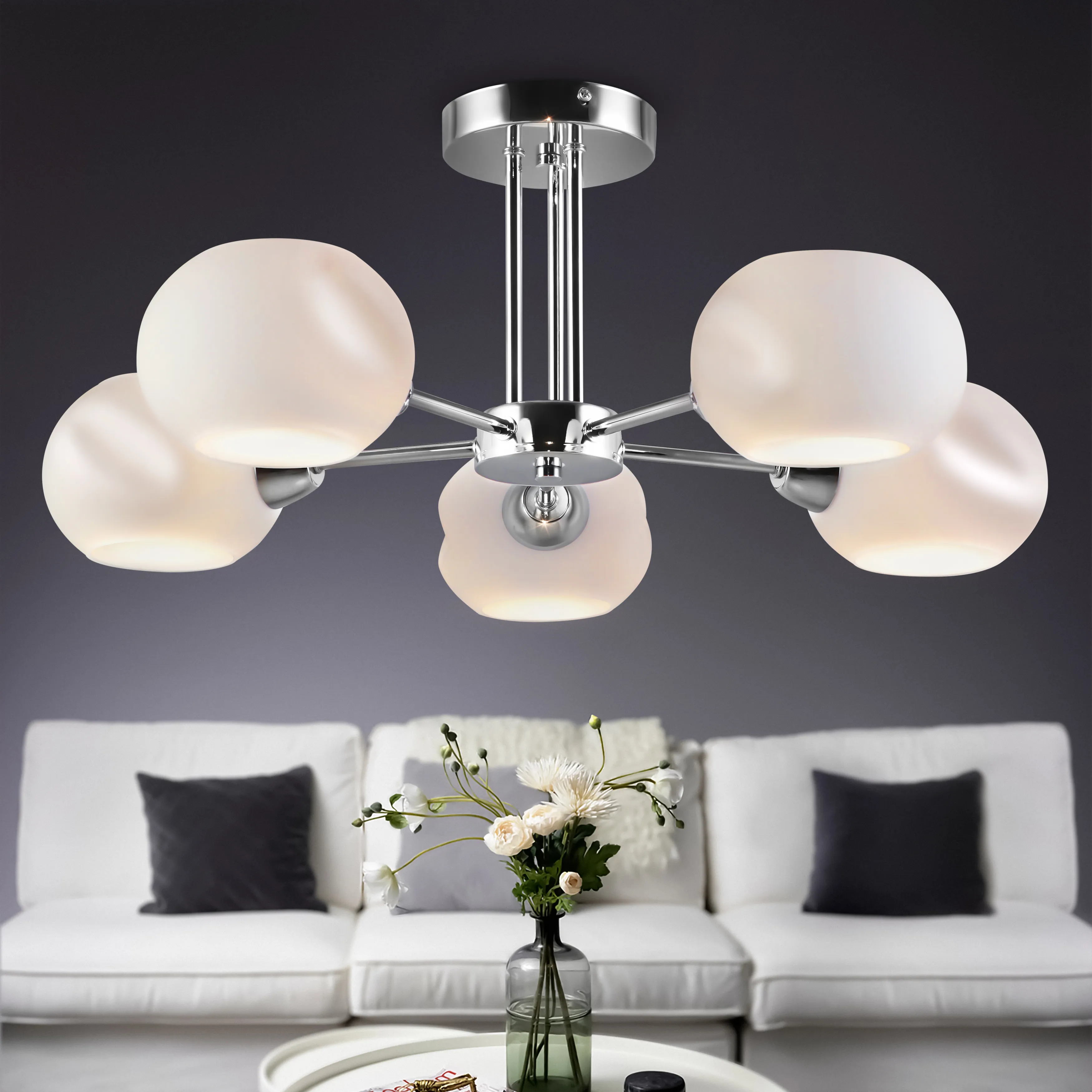 Rivoli Doris в стиле модерн – дизайнерская коллекция люстр и бра с хромированной арматурой и фигурными округлыми плафонами из матового стекла. В коллекцию входят: бра настенное под 1 лампу (арт. 2080-401), люстра потолочная на штанге с 5 плафонами (арт. 2080-305), люстра потолочная на штанге с 7 плафонами (арт. 2080-307).