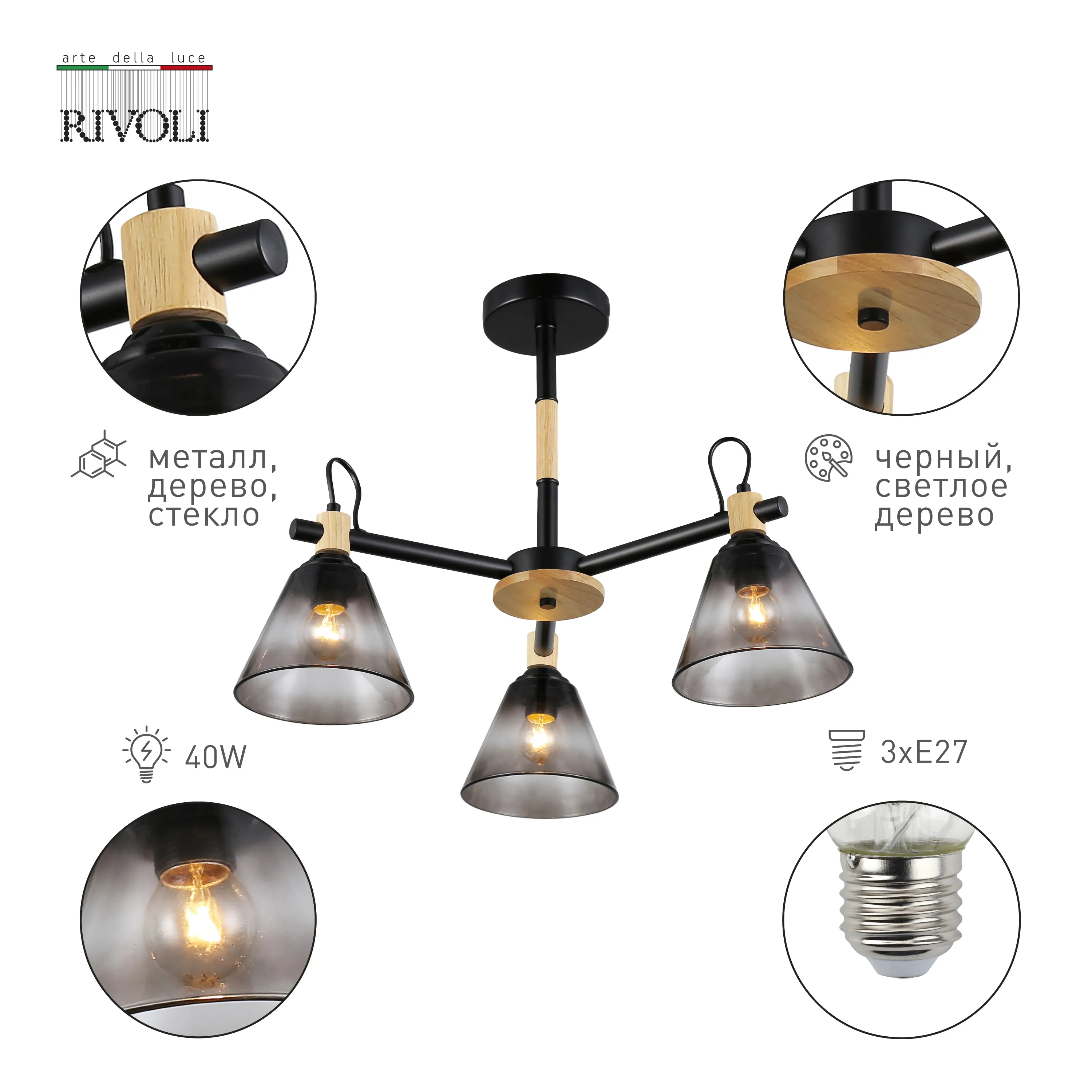 <p>В каркасных люстрах Rivoli Elmira немало интересных деталей. Элементы светлого дерева в контрасте с черным матовым металлом создают неповторимый внешний вид люстры. Арматура люстры проста и минималистична. Плафоны имеют глубокую сложную тонировку, есть эффектный декоративный вывод провода над плафонами.</p>