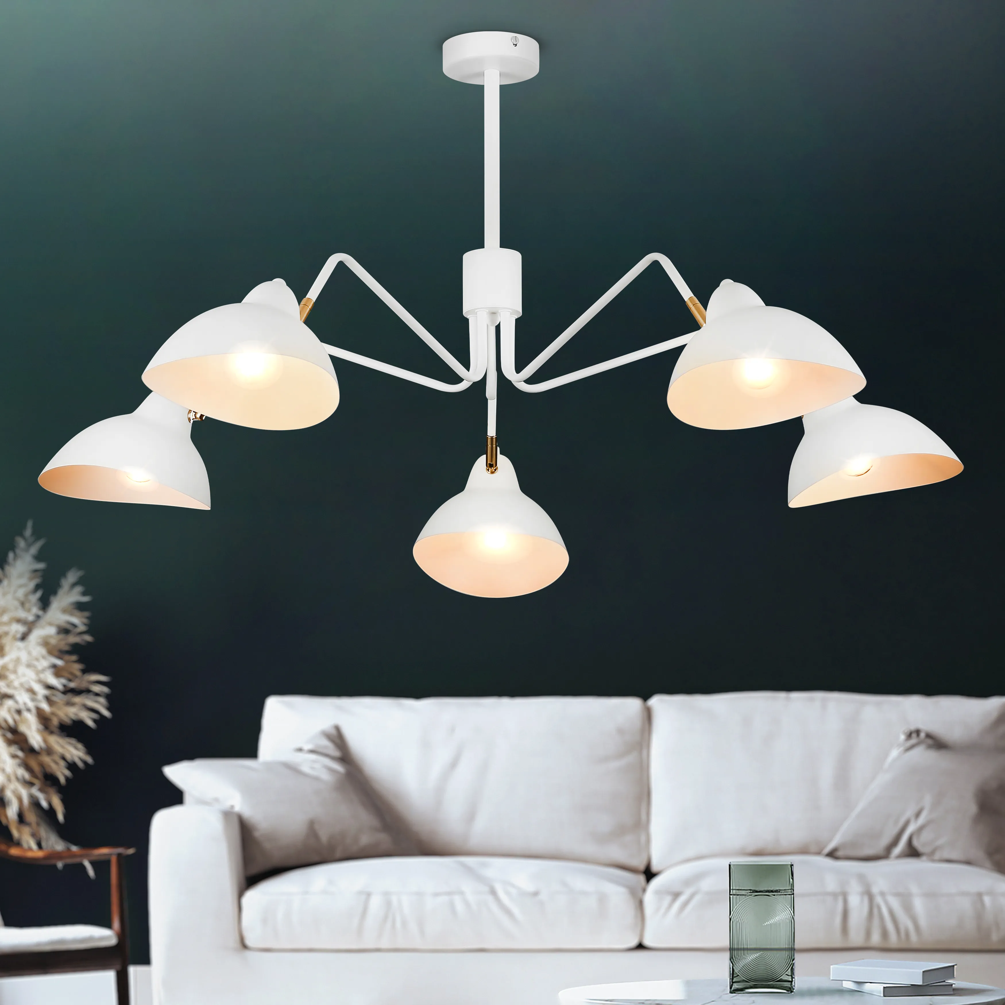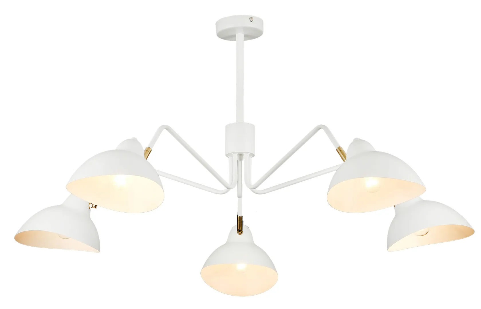 <p>Rivoli Georgia (арт. 4100-305) - металлическая люстра формата паук с козырьковыми плафонами под уличные ретро-фонари. Белая минималистичная люстра из металла прекрасно дополнит интерьеры с стиле лофт, лофт-кантри, в скандинавском стиле. Свет 5 плафонов люстры направлен вниз, что помогает организовать в комнате яркое основное освещение. Лампы для люстры потолочной на штанге Rivoli Georgia – Е14 40 Вт, приобретаются отдельно. Из ассортимента итальянского бренда Rivoli можно купить аналогичную люстру в чёрном цвете – арт. 4101-305. </p>