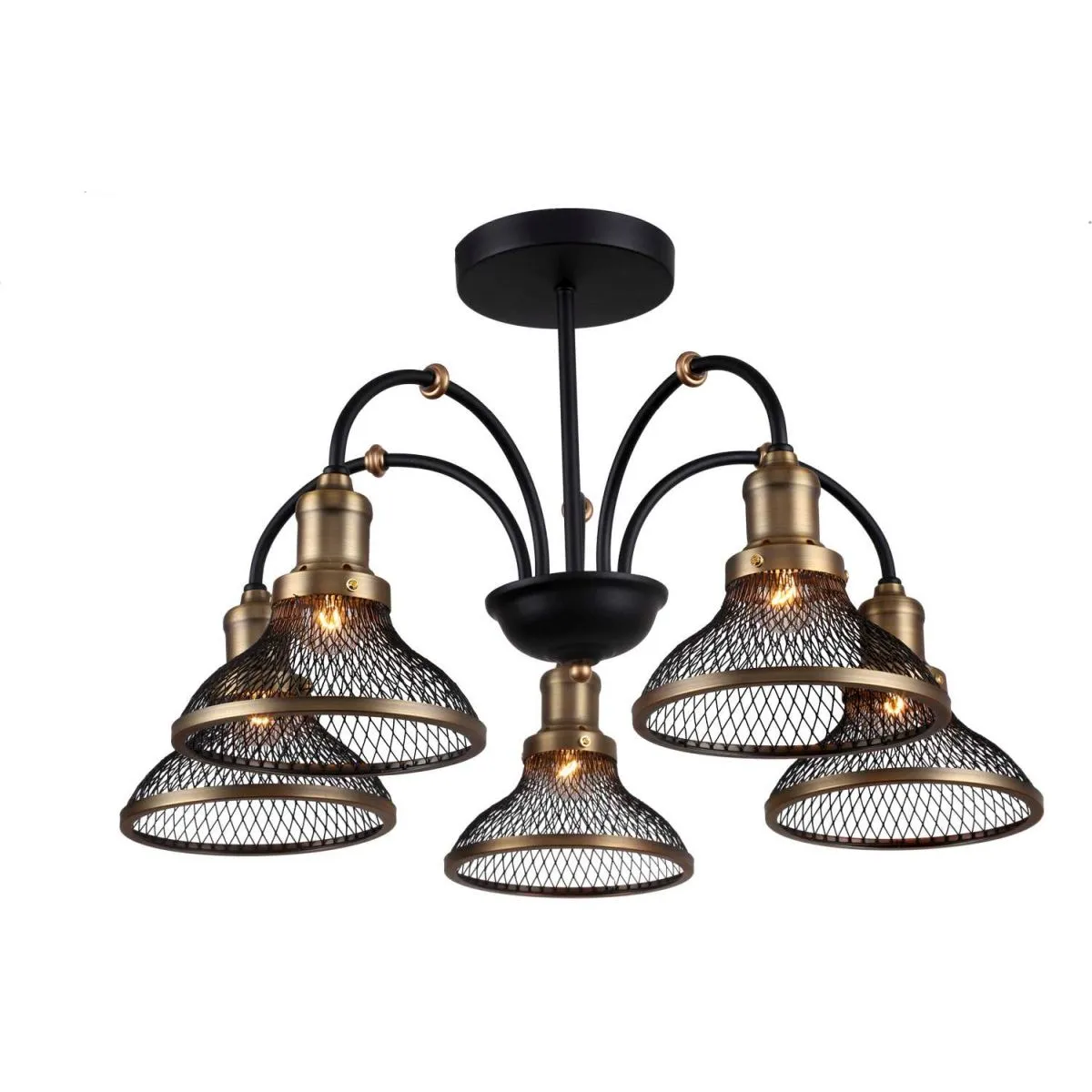 Люстра потолочная на штанге из коллекции Feloria выполнена из металла, окрашенного в черный цвет. Отдельные элементы арматуры гальванизированы в цвет бронзы. Плафоны, окрашенные в цвет арматуры, выполнены в виде сетки.