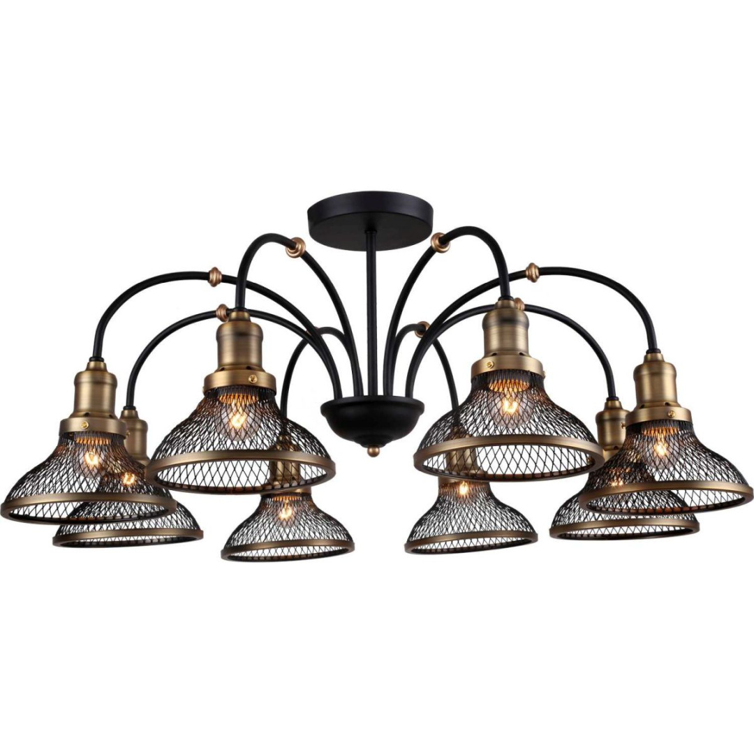 Люстра потолочная на штанге из коллекции Feloria выполнена из металла, окрашенного в черный цвет. Отдельные элементы арматуры гальванизированы в цвет бронзы. Плафоны, окрашенные в цвет арматуры, выполнены в виде сетки.