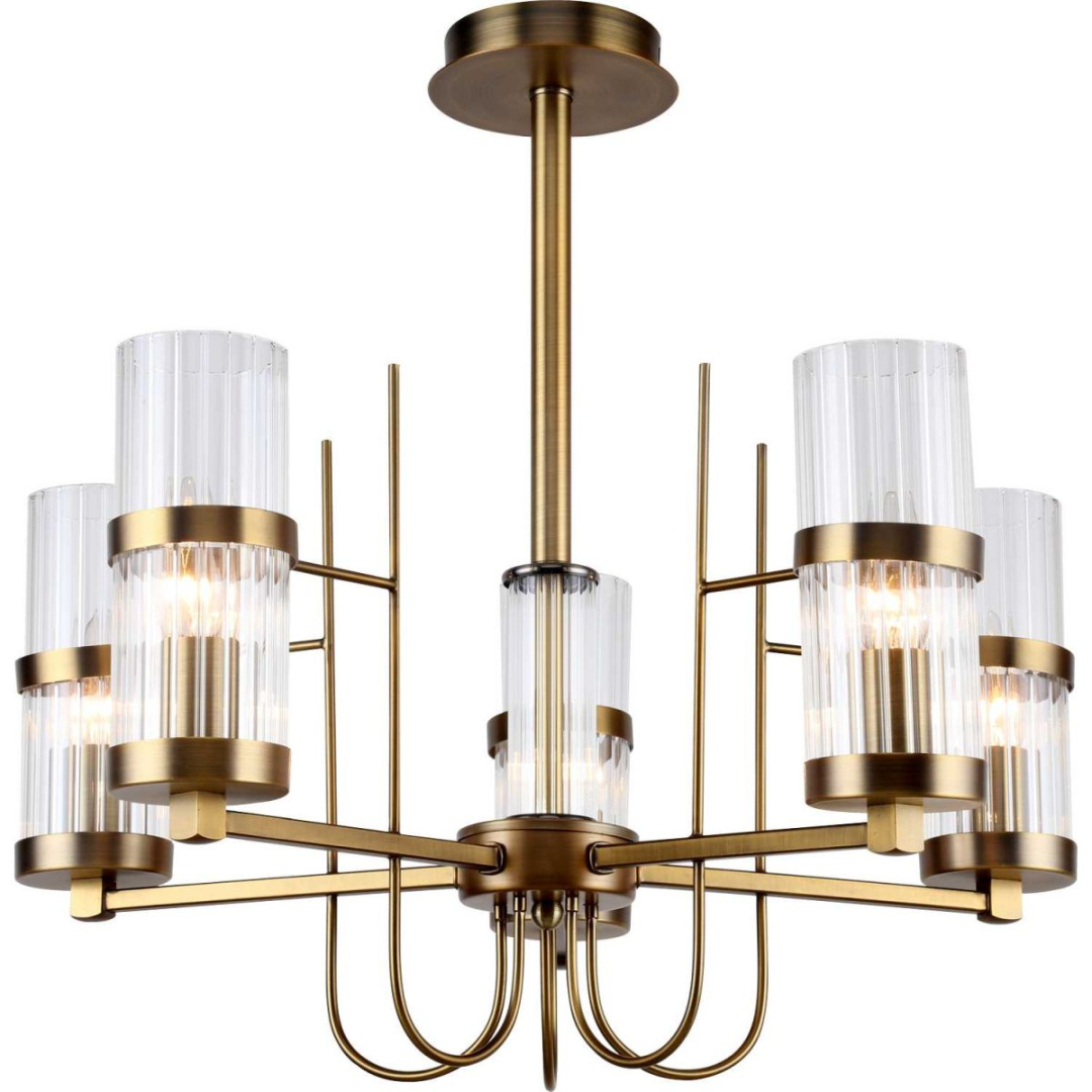 Люстра потолочная на штанге из коллекции Legion выполнена из металла, гальванизированного в цвет бронзы, и декорирована вытянутыми плафонами из прозрачного фактурного стекла линейной текстуры.