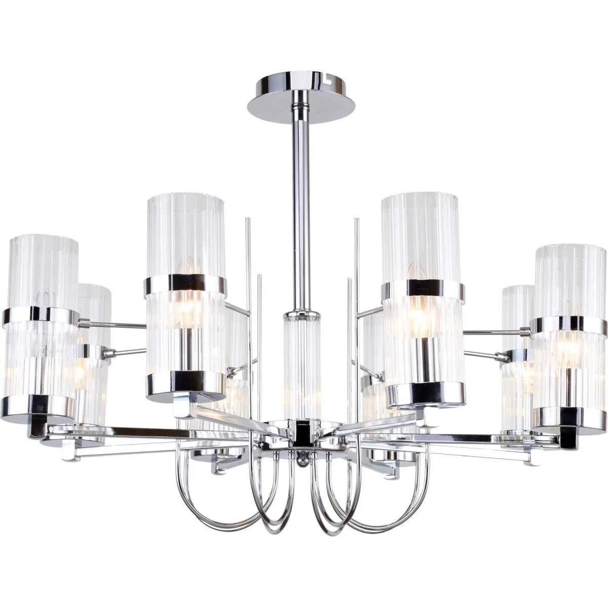 Люстра потолочная на штанге из коллекции Legion выполнена из металла, гальванизированного в цвет хрома, и декорирована вытянутыми плафонами из прозрачного фактурного стекла линейной текстуры.