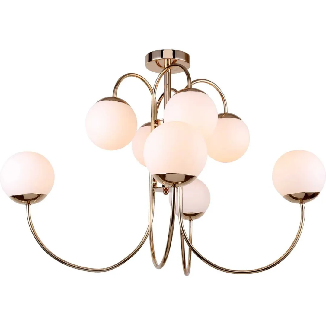 Люстра потолочная из коллекции Miracle выполнена из металла, гальванизированного в цвет золота, и декорирована круглыми плафонами из белого матового стекла.