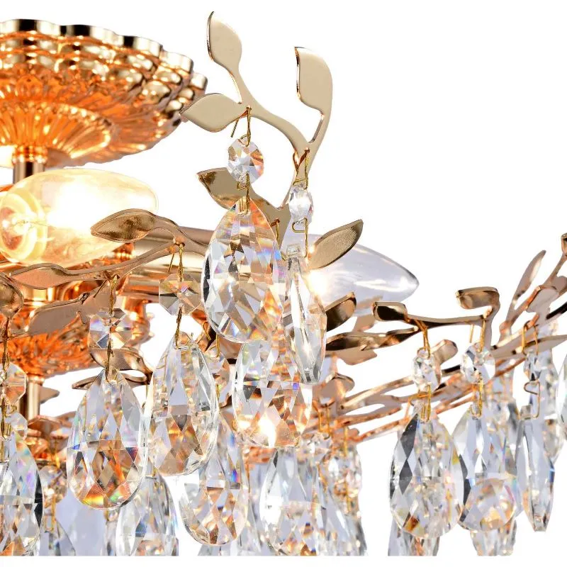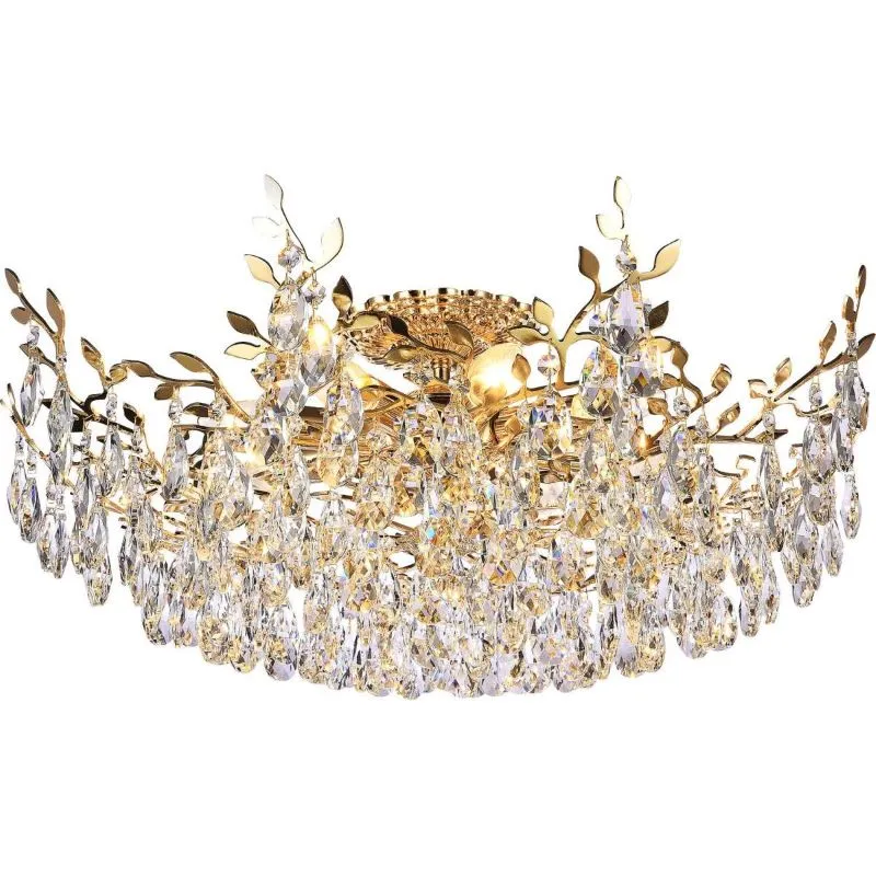 Люстра потолочная из коллекции Sofia выполнена из металла, гальванизированного в цвет золота, и декорирована прозрачным хрусталем высшей категории миндалевидной формы. Хрусталь крепится на декоративные металлические элементы в виде веток и листьев, гальванизированные в цвет арматуры.