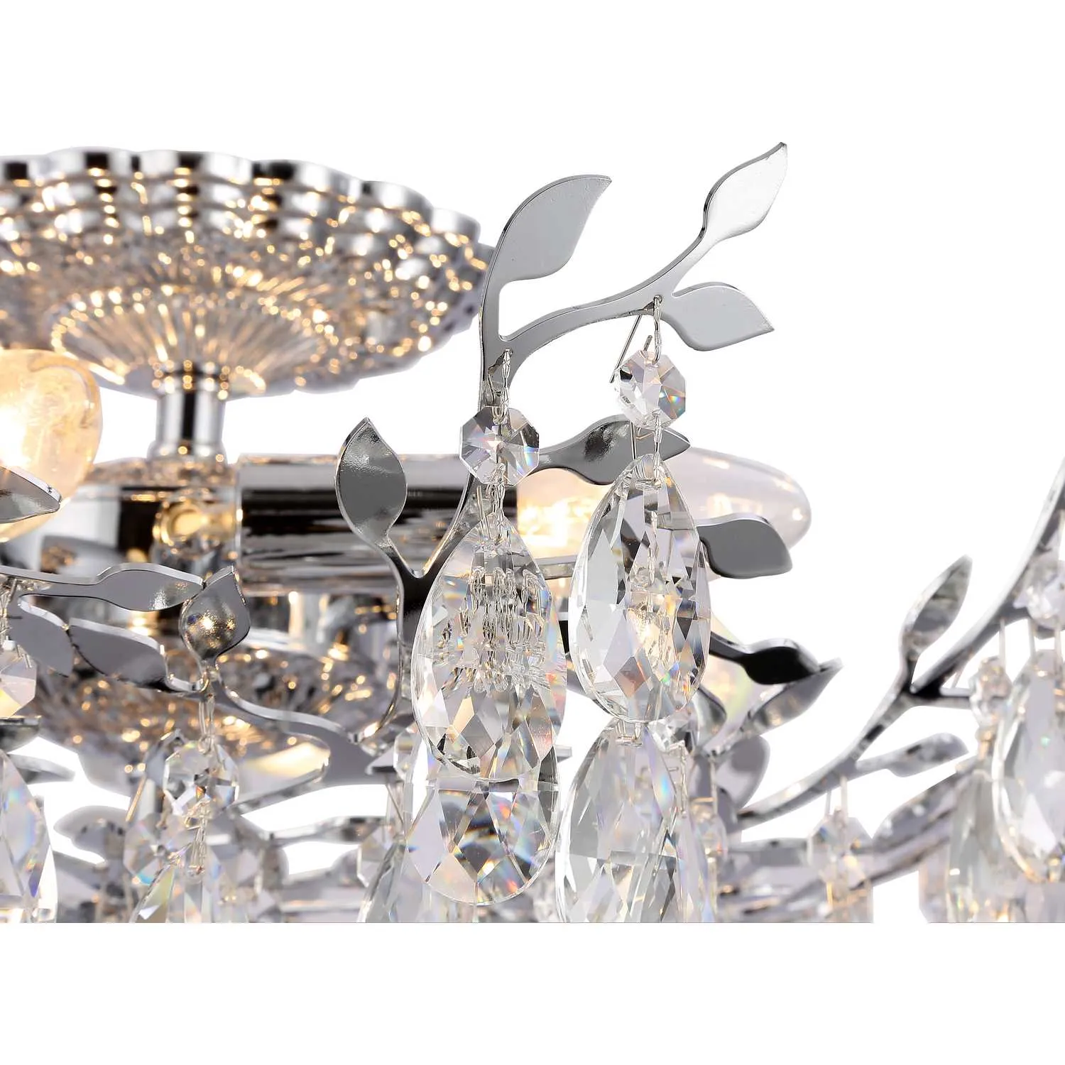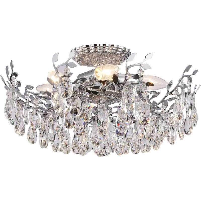 Люстра потолочная из коллекции Sofia выполнена из металла, гальванизированного в цвет хрома, и декорирована прозрачным хрусталем высшей категории миндалевидной формы. Хрусталь крепится на декоративные металлические элементы в виде веток и листьев, гальванизированные в цвет арматуры.