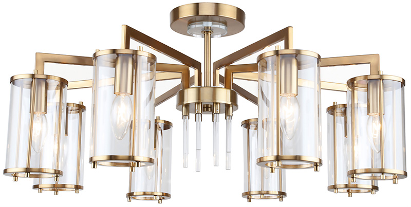 Люстра потолочная из коллекции Vase выполнена из металла, гальванизированного в цвет бронзы, и декорирована стеклянными стержнями и вытянутыми прозрачными стеклянными плафонами. Плафоны отделаны металлическими кантами, дополнительно закрепленными металлическими стержнями, гальванизированными в цвет арматуры.