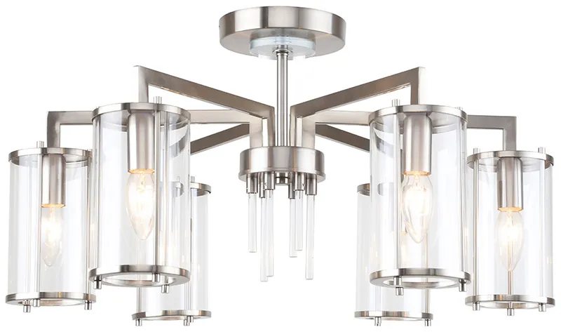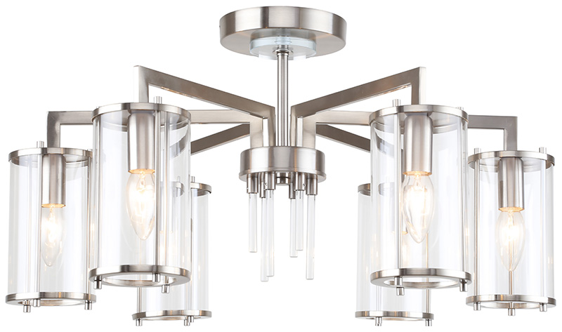 Люстра потолочная из коллекции Vase выполнена из металла, гальванизированного в цвет никеля, и декорирована стеклянными стержнями и вытянутыми прозрачными стеклянными плафонами. Плафоны отделаны металлическими кантами, дополнительно закрепленными металлическими стержнями, гальванизированными в цвет арматуры.