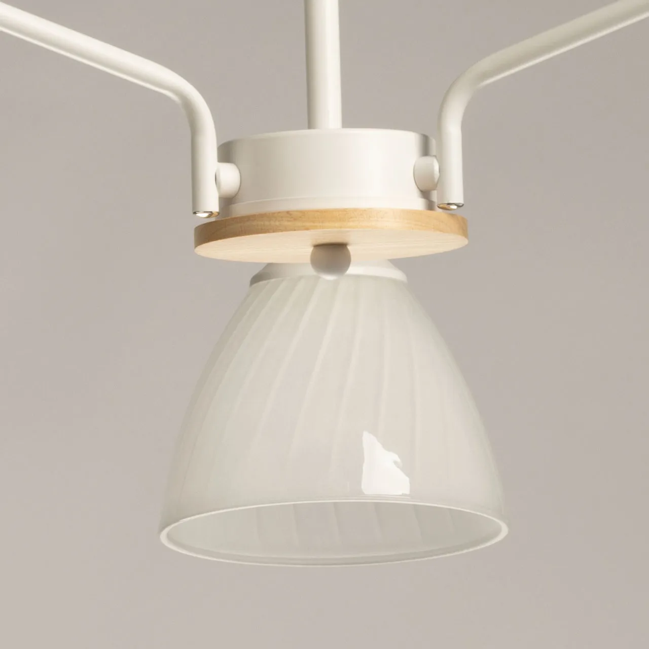 Металлическое основание потолочной люстры окрашено в белый цвет. Стеклянные плафоны отлиты в форму и окрашены в белый цвет с внутренней стороны. Светильник декорирован элементами из натурального светлого дерева.