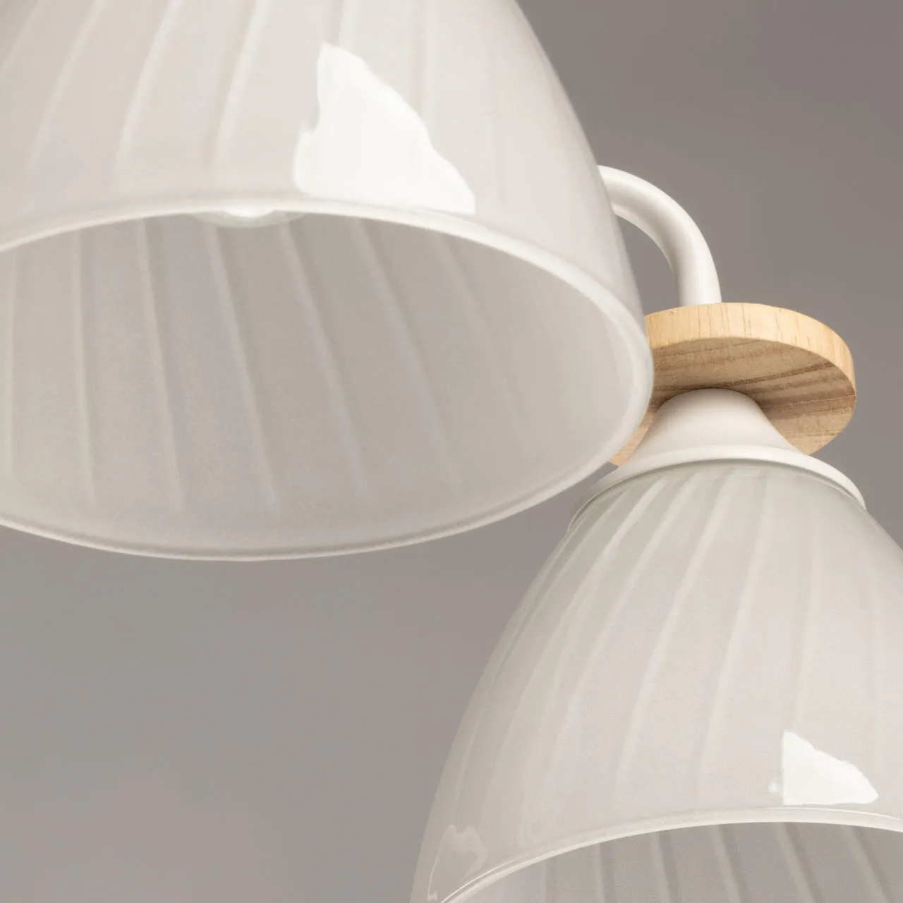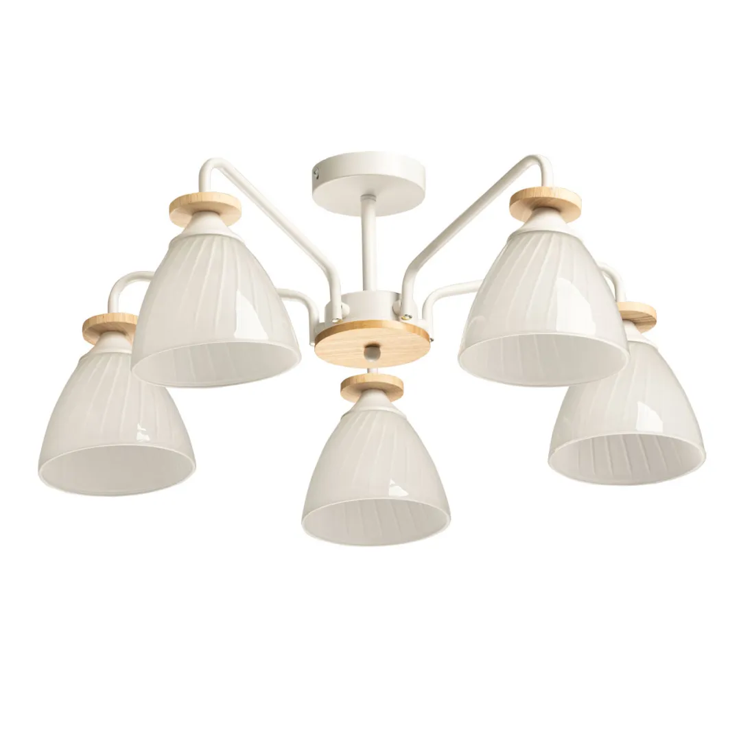 Металлическое основание потолочной люстры окрашено в белый цвет. Стеклянные плафоны отлиты в форму и окрашены в белый цвет с внутренней стороны. Светильник декорирован элементами из натурального светлого дерева.