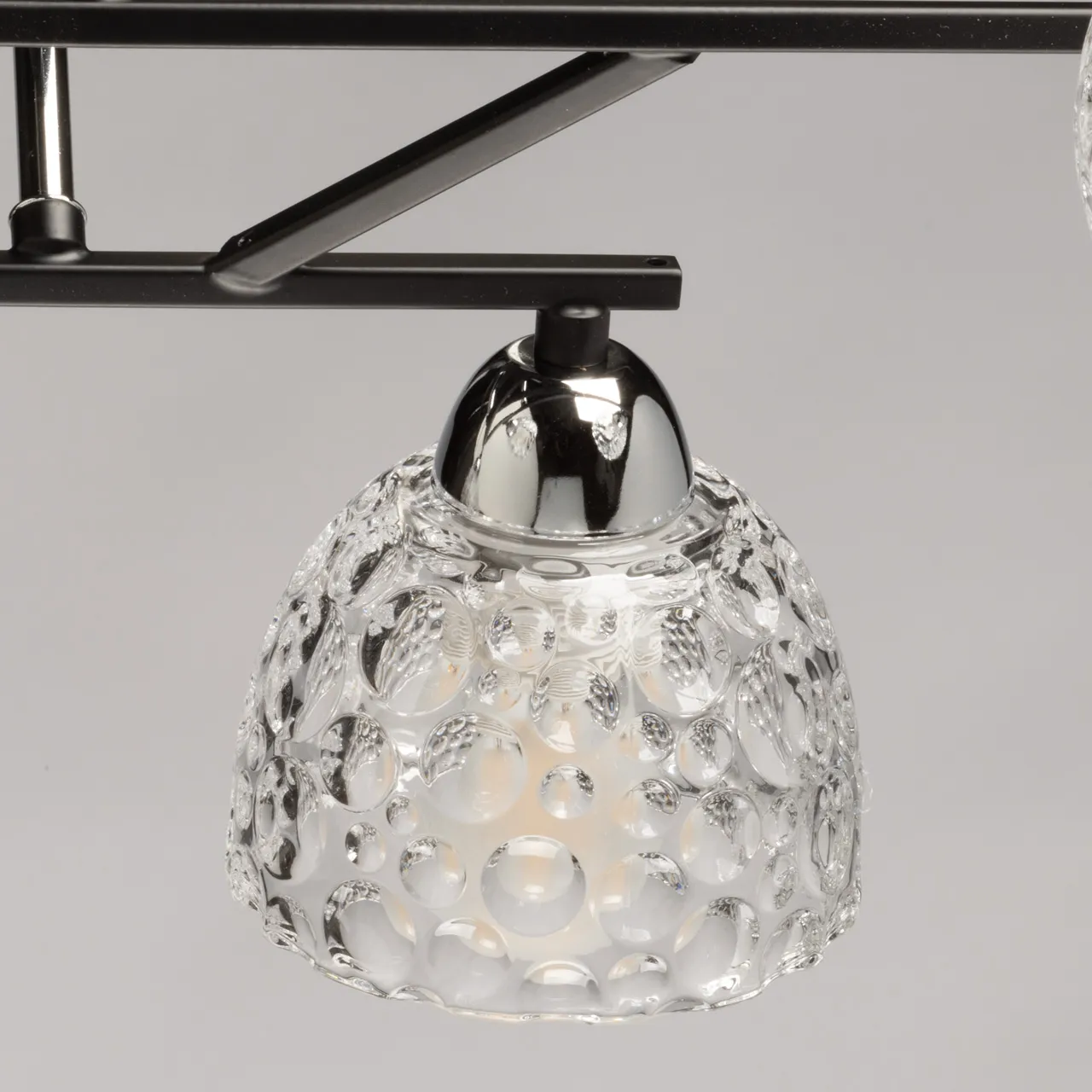 Основание светильника выполнено в форме квадрата из прочного металла, окрашенного в глубокий черный цвет. Этот цвет не только придает изделию строгость и элегантность, но и делает его универсальным элементом, который легко впишется в различные стили интерьера. Плафоны светильника выполнены из прозрачного стекла, отлитого в уникальную форму с текстурным рисунком. Этот интересный дизайн не только добавляет визуального интереса, но и создает эффект игры света и тени, наполняя комнату мягким и уютным светом. Прозрачное стекло позволяет свету свободно проходить, а пузырьковая текстура придает плафонам оригинальность и шарм.Светильник оснащен четырьмя плафонами на шарнирах, что позволяет менять направление света в зависимости от ваших потребностей. Это особенно удобно для создания локального освещения, когда необходимо выделить определенные зоны в комнате, например, рабочую область или угол для чтения. Возможность регулировки направления света делает этот светильник универсальным инструментом для освещения.Цоколь E14 позволяет использовать лампы различной мощности, что дает возможность адаптировать яркость освещения под конкретные задачи. Такой светильник отлично подходит для освещения комнат площадью до 8 кв. метров, что делает его идеальным выбором для небольших помещений.Светильник из коллекции Торес прекрасно вписывается в различные стили интерьера. Его минималистичный дизайн идеально подходит для современных интерьеров в стиле минимализм, где важна простота и функциональность. В то же время, черный металл и текстура стекла делают его отличным дополнением к интерьеру в стиле лофт, где преобладают индустриальные элементы и открытые пространства.