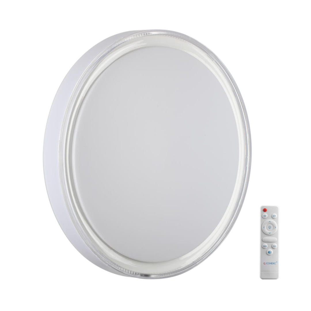 Светильник 7699/EL линии LAVEN состоит из металлического основания (базы) и пластикового рассеивателя. Материал рассеивателя - высококачественный пластик марки PMMA 2.0 белого цвета с матовой поверхностью, без текстуры. Пластик обеспечивает светильнику равномерное рассеивание и хорошее светопропускание. Форма плафона: круглая, декорирована светопропускающим ободом из гладкого пластика белого цвета. Степень защиты IP43 позволяет использовать светильник в определенных зонах влажных помещений. В комплект входит заменяемый LED модуль с линзами, мощностью 70Вт, которая соответствует лампе накаливания 610Вт. А также пульт ДУ (с креплением на стену), с помощью которого осуществляется плавное изменение цветовой температуры 3000-6000К, изменение яркости, переход в режим переключения теплого/белого/холодного/ночного света. Светильник имеет функцию "память".