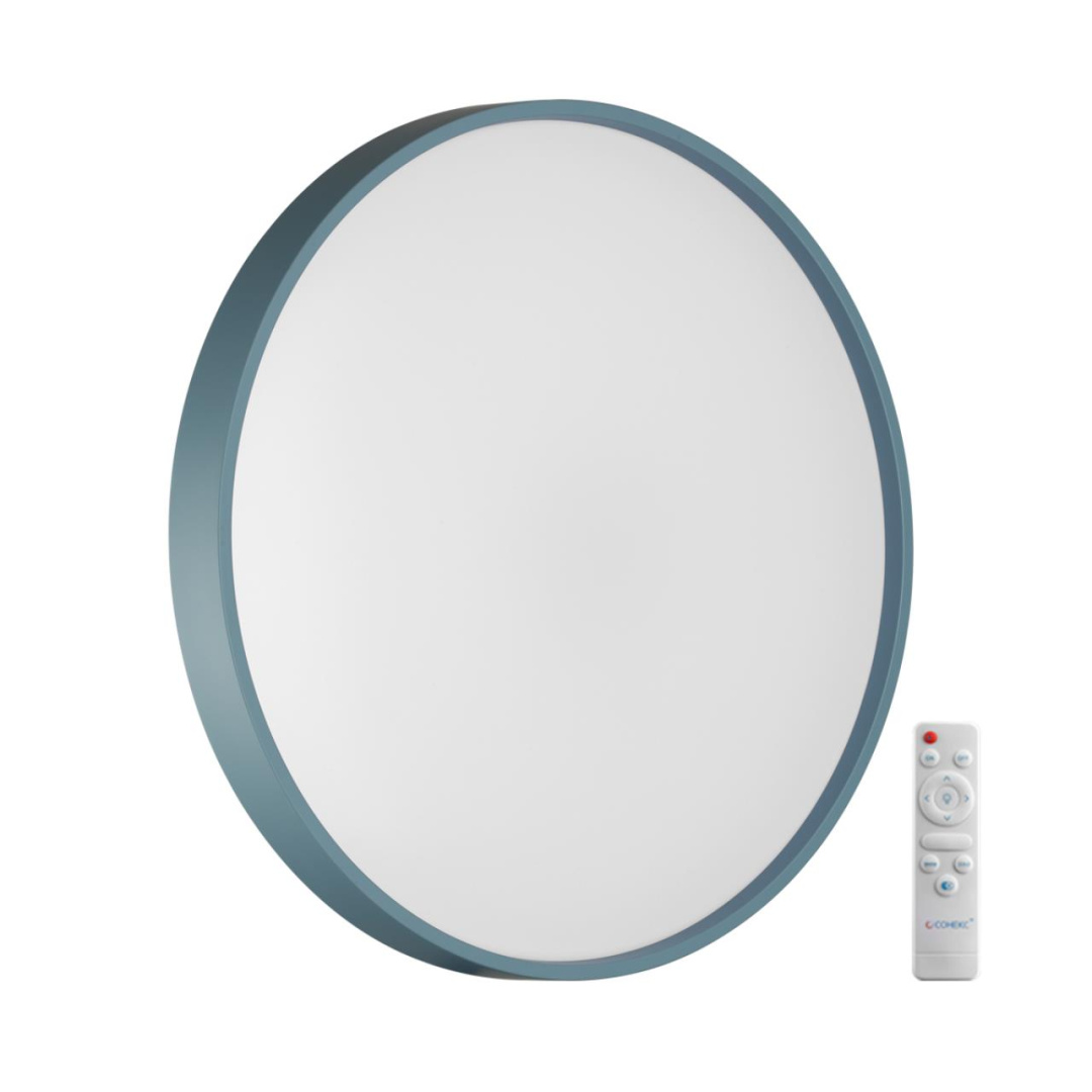 Светильник 7745/DL линии MAVIC состоит из металлического основания (базы) и пластикового рассеивателя. Материал рассеивателя - высококачественный пластик марки PMMA 2.0 белого цвета с глянцевой поверхностью, обеспечивающий светильнику равномерное рассеивание и хорошее светопропускание. Форма плафона: круглая, декорирована ободом синего цвета на плафоне. Степень защиты IP43 позволяет использовать светильник в определенных зонах влажных помещений. В комплект входит заменяемый LED модуль с линзами, мощностью 48Вт, которая соответствует лампе накаливания 440Вт. А также пульт ДУ, с помощью которого осуществляется плавное изменение цветовой температуры 3000-6000К, изменение яркости, переход в режим переключения теплого/белого/холодного/ночного света. Светильник имеет функцию "память".