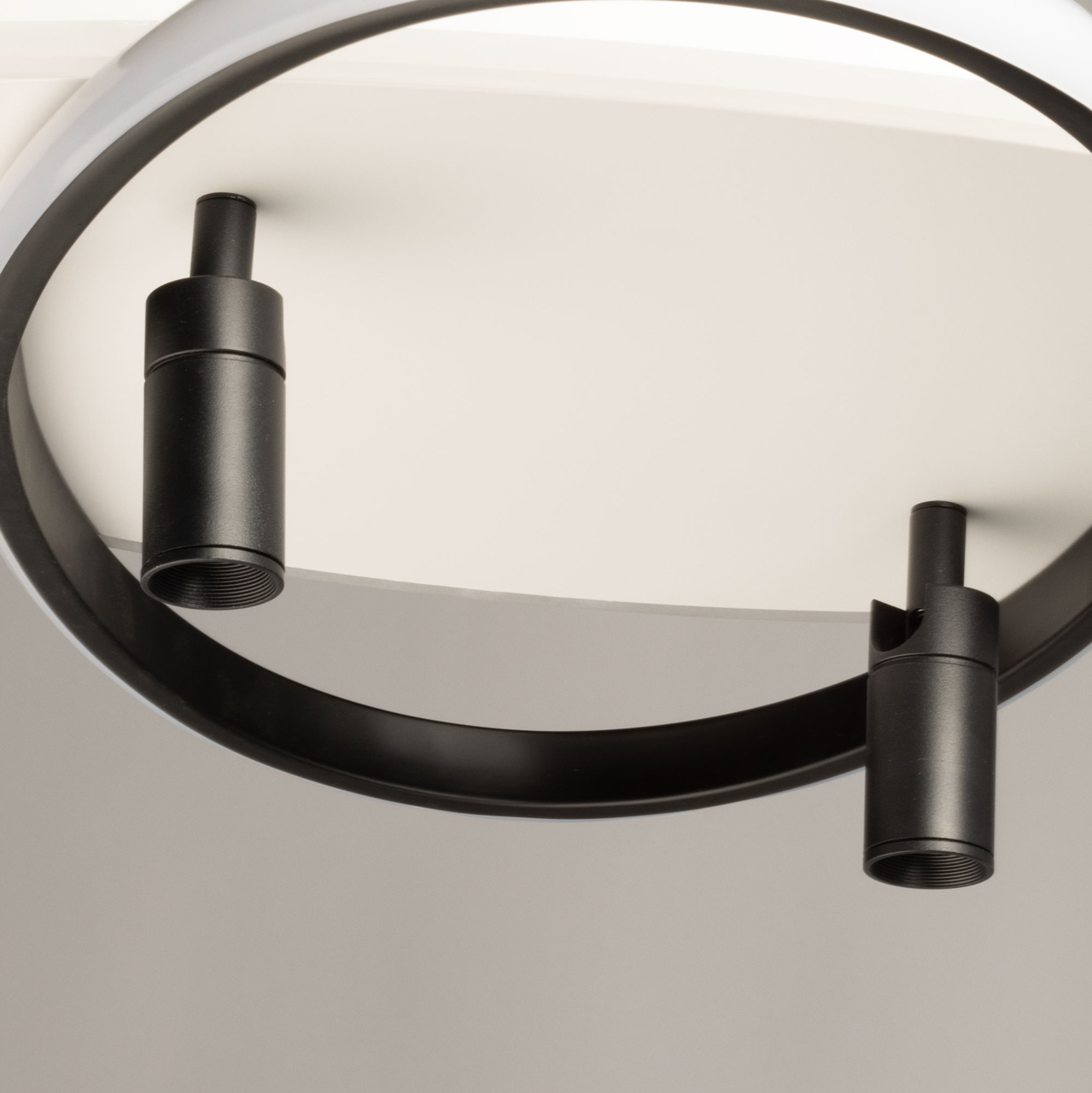 Металлическое основание потолочной люстры окрашено в белый цвет. Корпус плафона выполнен из сплава алюминия с цинком и окрашен в черный цвет. Светодиодный источник света закрыт матовым акрилом.