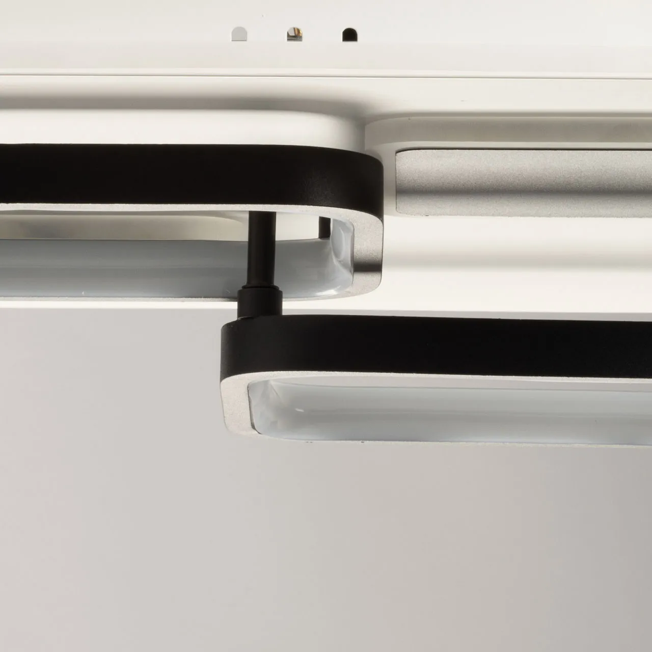 Металлическое основание потолочной люстры окрашено в белый цвет. Корпус плафона выполнен из сплава алюминия с цинком и окрашен в черный цвет. Светодиодные источники света закрыты матовым акрилом.