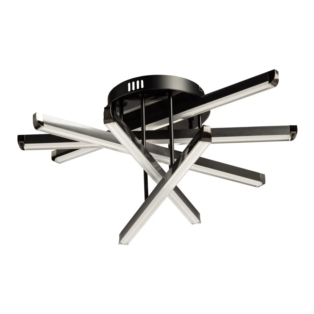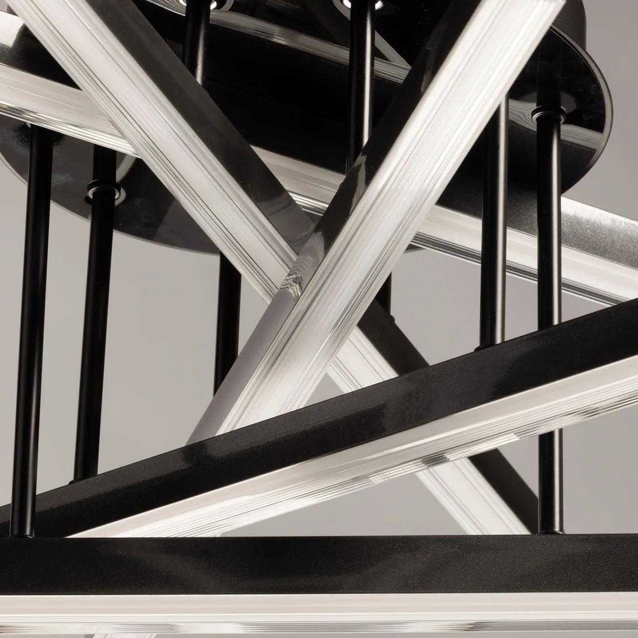 Металлическое основание потолочной люстры гальванизировано в серый цвет. Светодиодные источники свет закрыты белым акрилом.