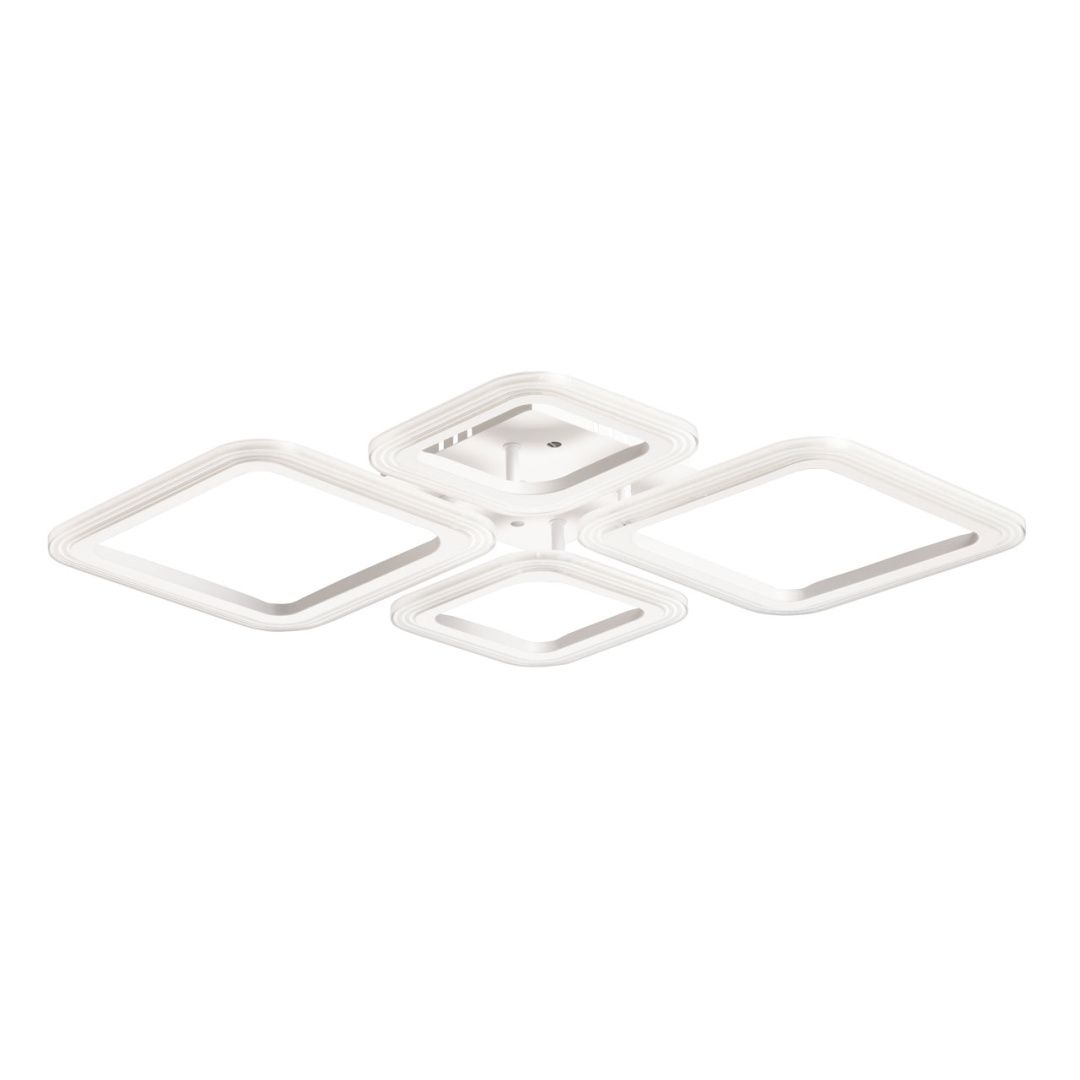 Металлическое основание потолочной люстры окрашено в белый цвет. Корпус плафона выполнен из сплава алюминия с цинком и окрашен в цвет основания. Светодиодный источник света закрыт полупрозрачным акрилом.