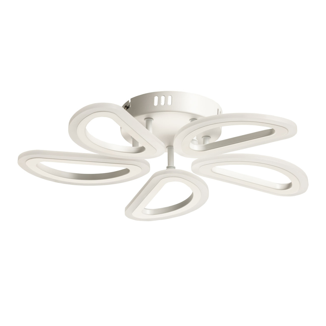 Металлическое основание потолочной люстры окрашено в белый цвет. Корпус плафонов выполнен из сплава алюминия с цинком и окрашен в цвет основания. Светодиодные источники света закрыты белым матовым акрилом.