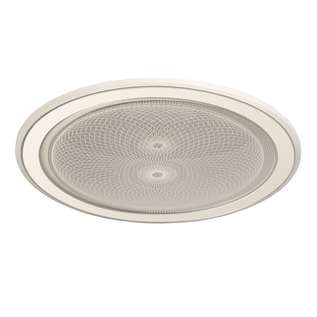Металлическое основание светильника окрашено в белый цвет. Плафон выполнен из сплава алюминия с цинком и окрашен белый цвет. Светодиодные источники света закрыты белым матовым акрилом. Потолочная люстра декорирована металлической пластиной, гальванизированной в цвет хрома и прозрачным акрилом с 3D-эффектом.
