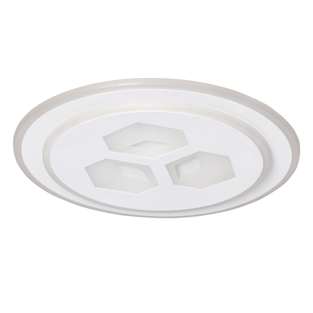 Металлическое основание потолочной люстры окрашено в белый цвет. Корпус плафона выполнен из сплава алюминия с цинком и окрашен в цвет основания. Светодиодные источники света закрыты матовым акрилом с 3D-эффектом.