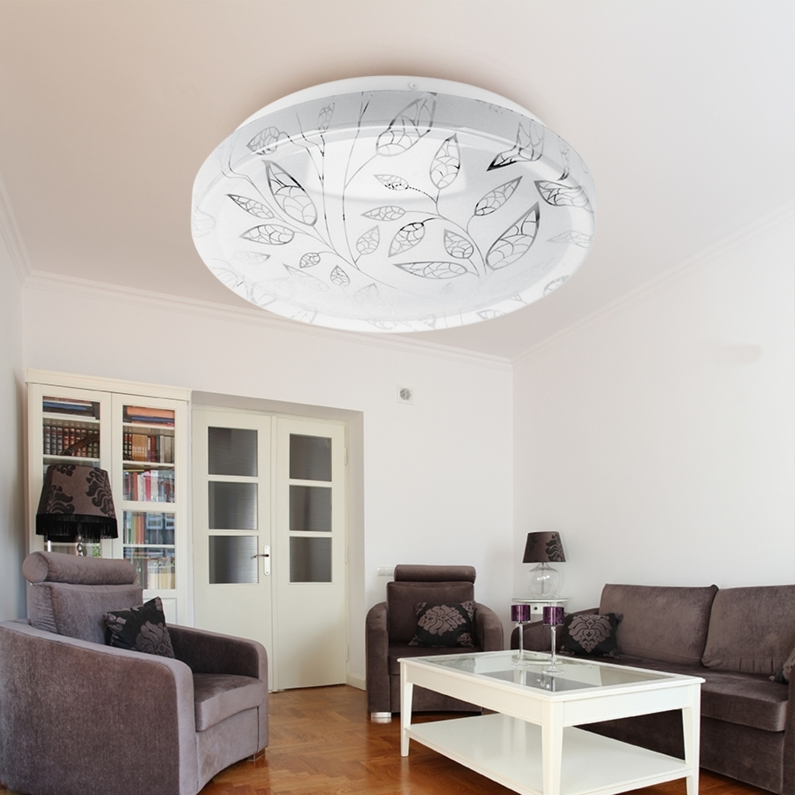 Плафон LED люстры декорирован изящным узором. Нежные ветки с лепестками гармонично смотрятся на круглом плоском корпусе. Такой светильник прекрасно подойдет для оформления гостиной, коридора, спальни или детской.