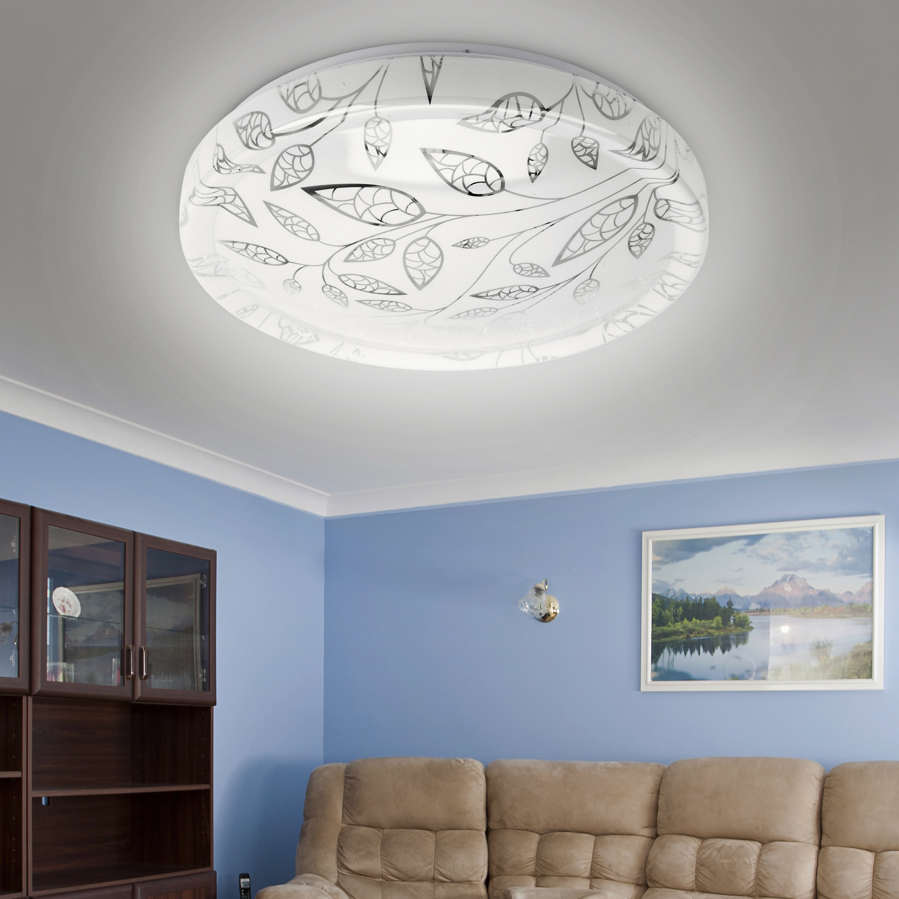 Плафон LED люстры декорирован изящным узором. Нежные ветки с лепестками гармонично смотрятся на круглом плоском корпусе. Такой светильник прекрасно подойдет для оформления гостиной, коридора, спальни или детской.
